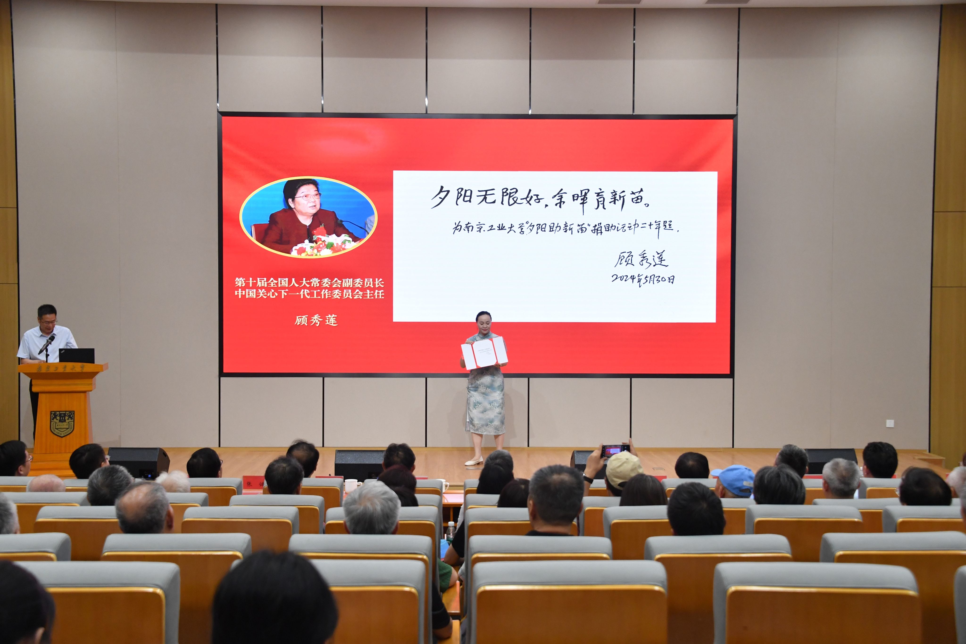 大会展示了第十届全国人大常委会副委员长、中国关心下一代工作委员会主任顾秀莲为“夕阳助新苗”捐助活动20年亲笔题词,播放了“夕阳助新苗”20年宣传短片。