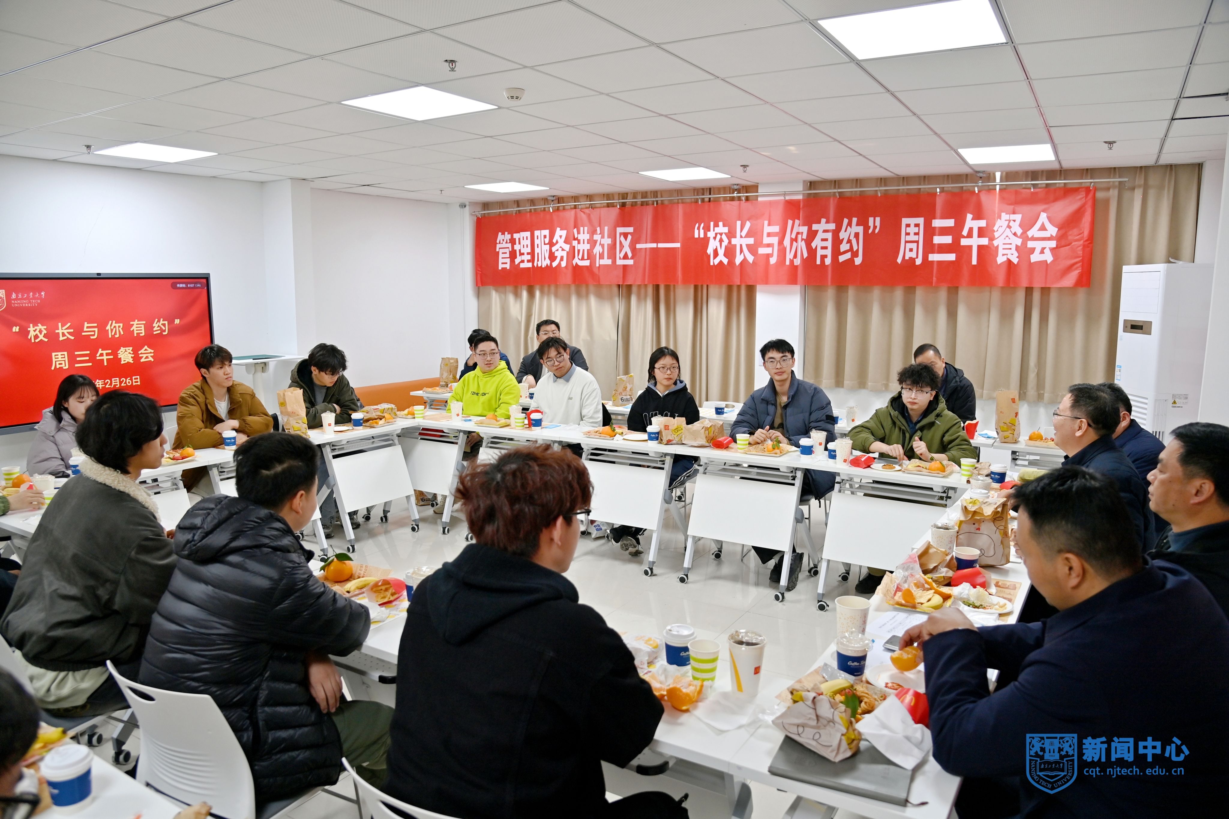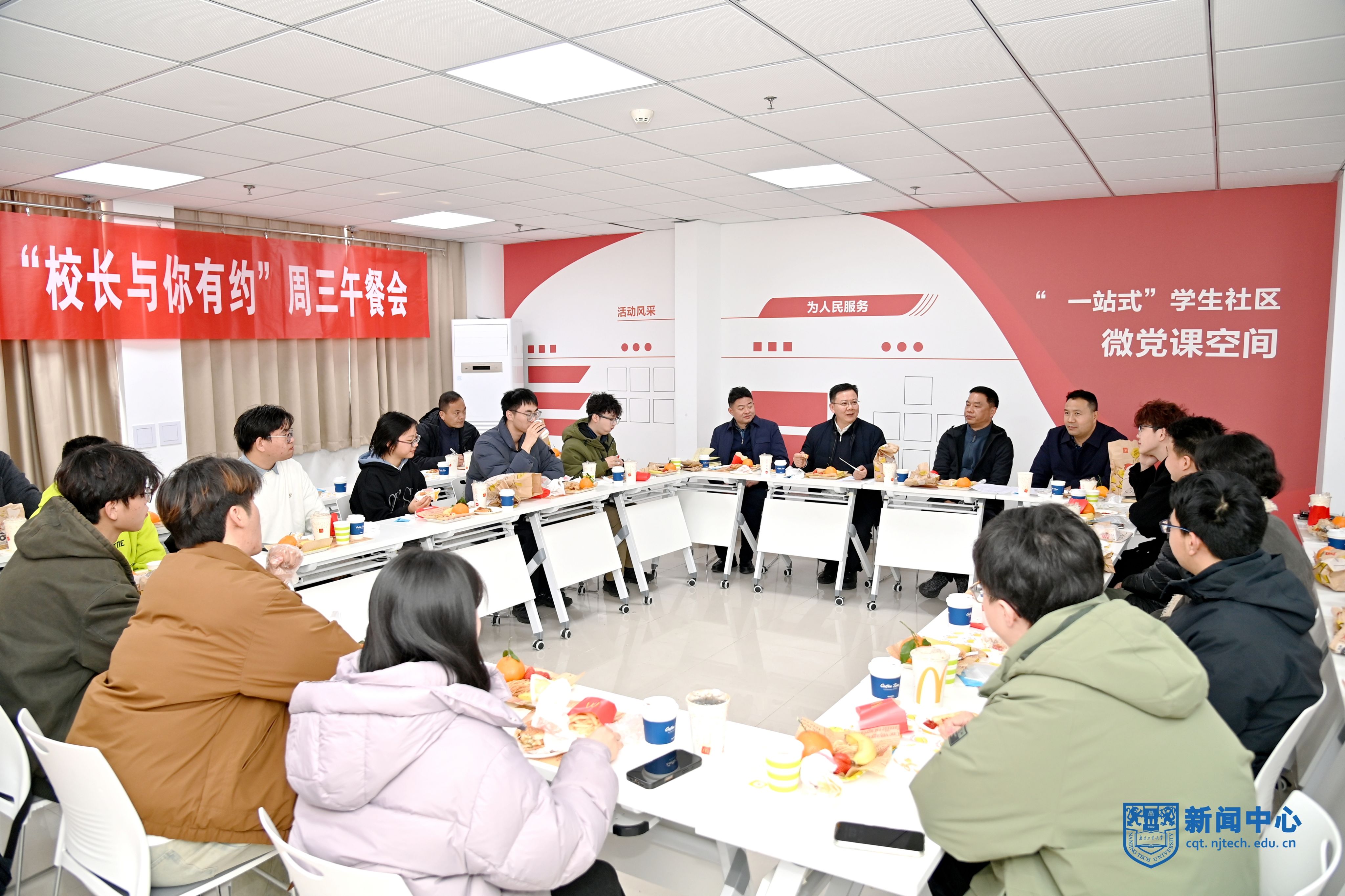 2月26日中午,学校在南苑“一站式”学生社区举行“校长与你有约”周三午餐会,校长蒋军成和20名学生代表畅谈大学生活,共话学校发展。校长办公室、学生工作处负责人及有关工作人员参加活动。