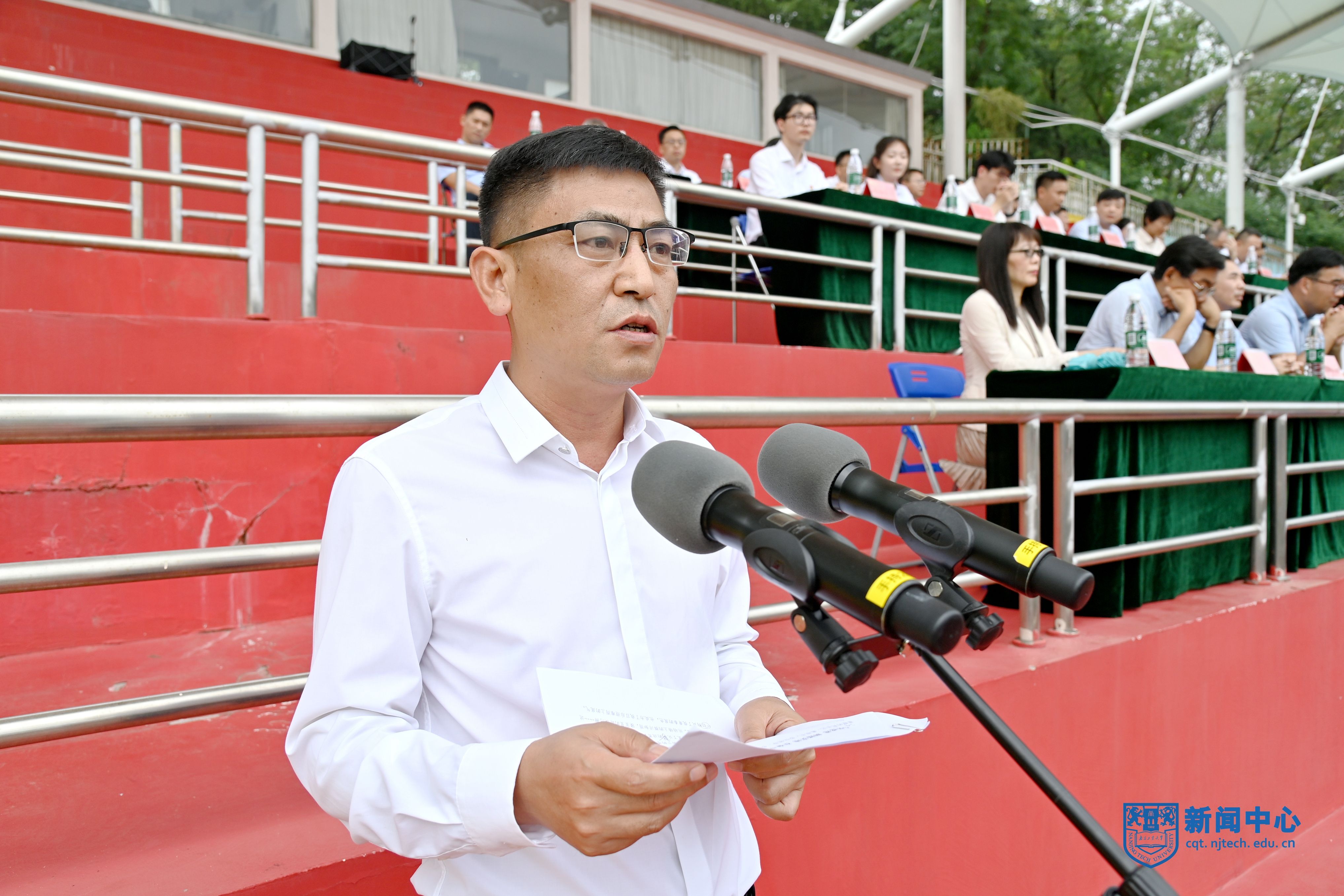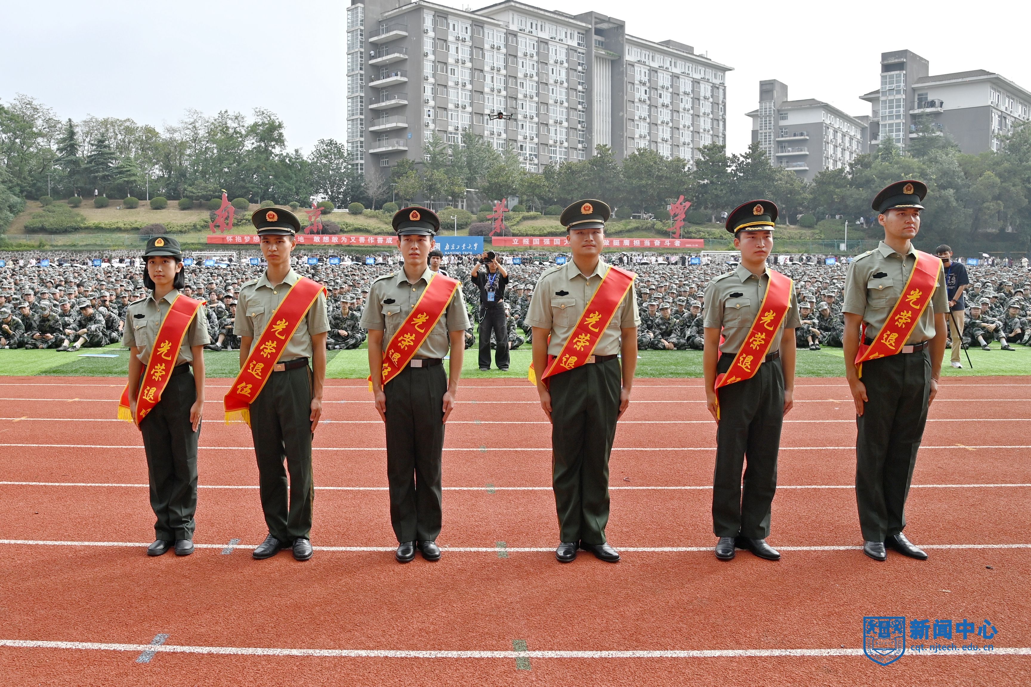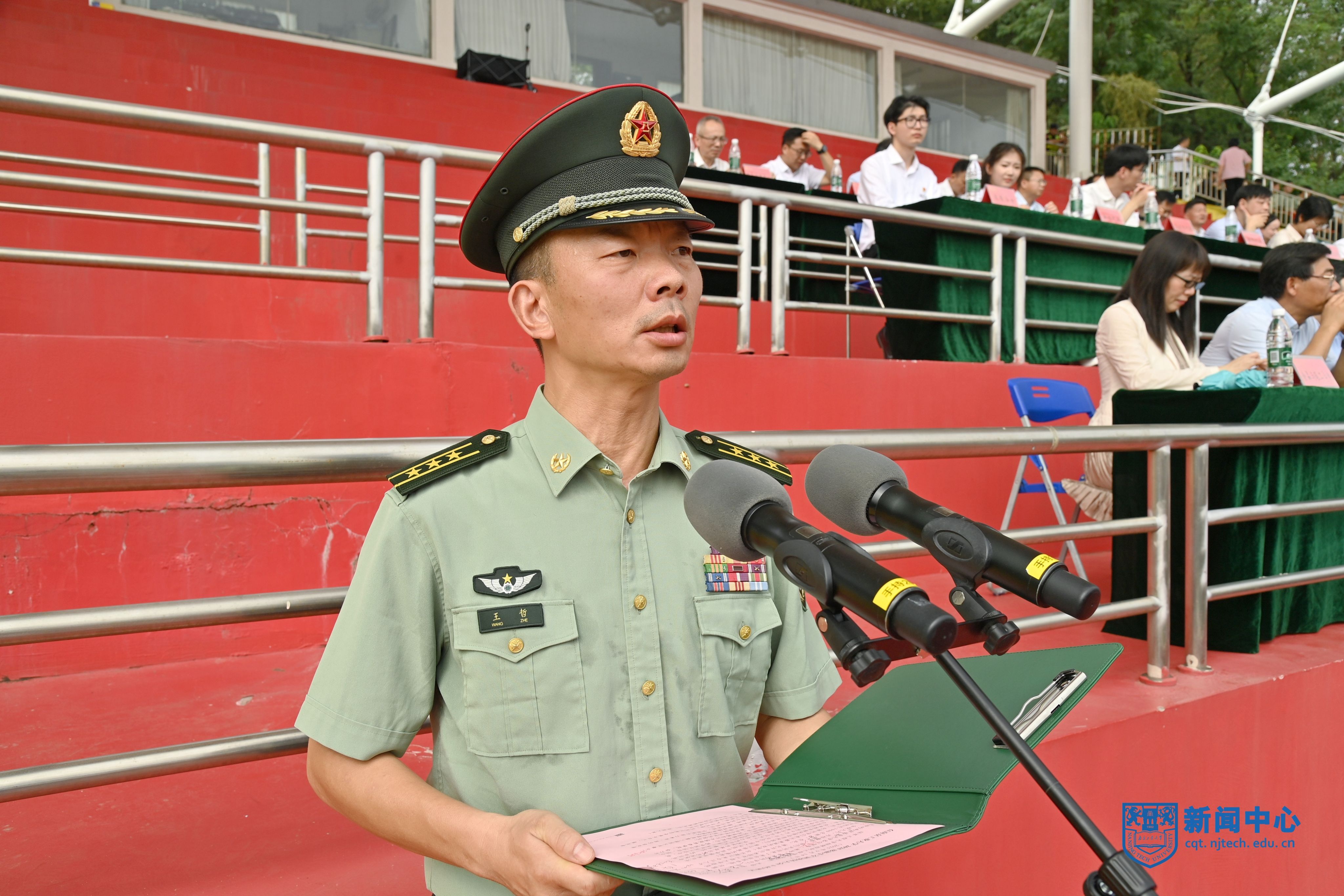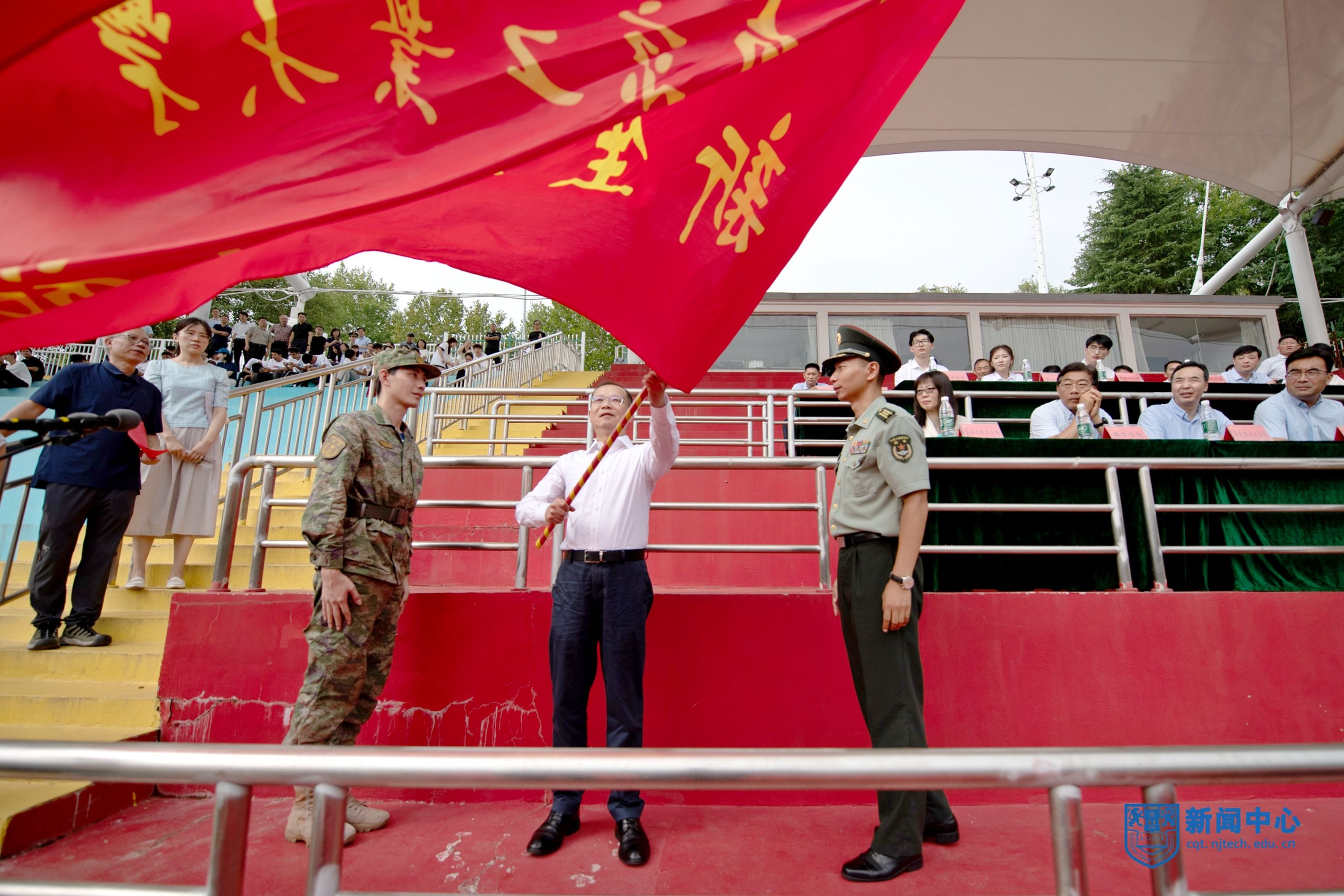 党委书记荆晅向新生军训旅授旗,并为退伍大学生佩戴光荣返校绶带。随后全体军训教官入场。王哲在讲话中,希望全体教官忠诚使命,严守纪律,以身示范引领广大新同学厚植家国情怀,锻炼过硬作风,扛起责任担当。