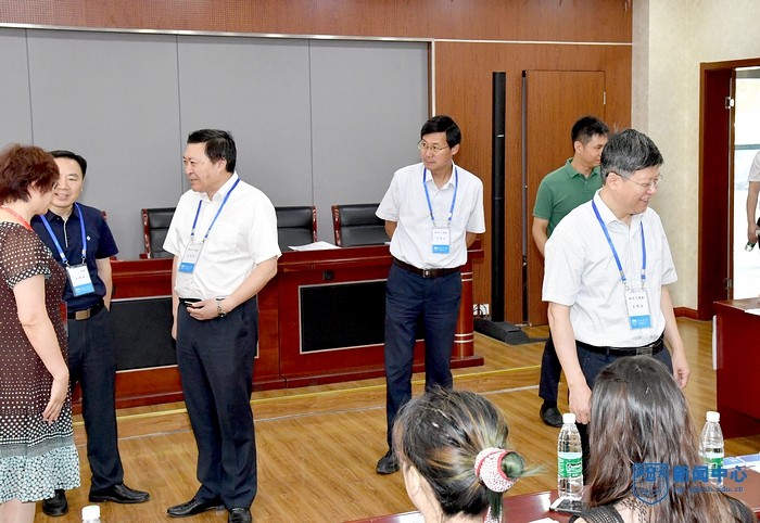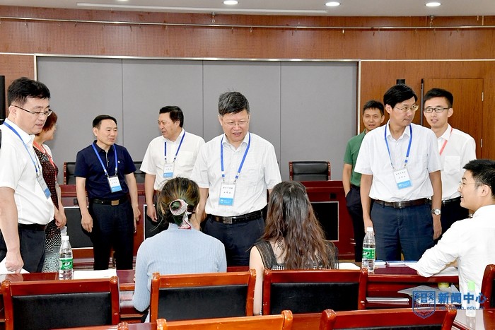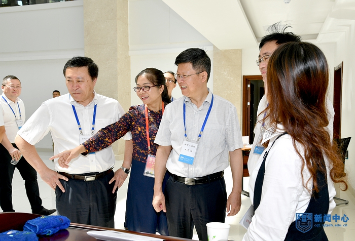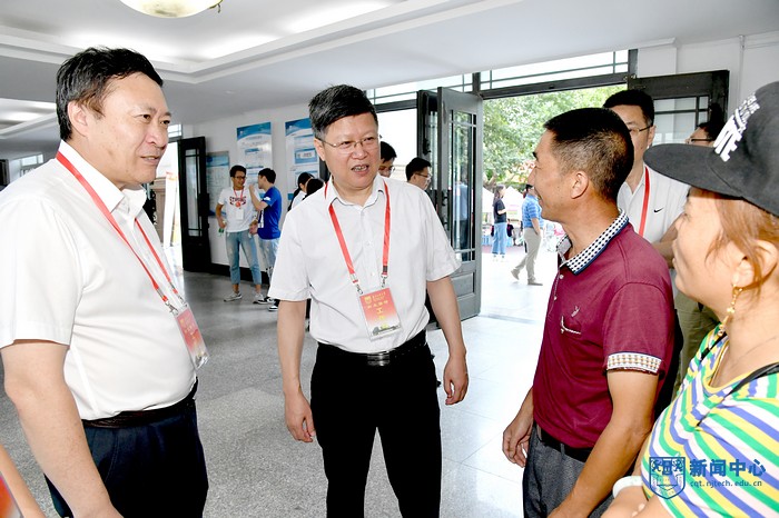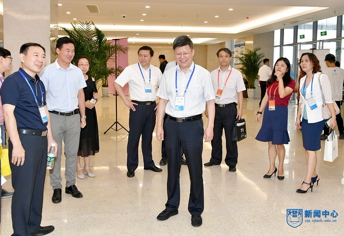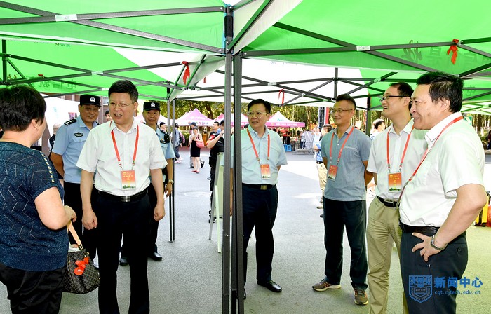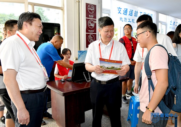上午,校党委书记芮鸿岩,校长乔旭,副校长刘伟庆,副校长崔益虎等校领导来到艺术、化工、生工、材料、土木等学院的新生接待工作现场,热烈欢迎2018级研究生新生,看望慰问工作人员和学生志愿者,仔细询问研究生新生的报到情况,并和办理手续的研究生亲切交流。