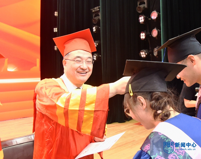 乔旭校长作了题为“青春奋进新时代 担当有为新征程”的讲话。他对毕业生提出了三点期望。一是立青春之志向,开时代之新局。新时代呼唤当代青年勇担使命、接续奋斗,同学们要将自己的理想同祖国的前途紧密联系起来,立下青春志向,明确奋斗目标,做好人生规划;二是扬青春之朝气,创人生之格局。艰难困苦,玉汝于成,同学们要坚定信念、昂扬斗志,保持勇往直前的精神气度,以积极进取的姿态迎接未来的挑战;三是展青春之风采,应社会之大局。鹰击天风壮,鹏飞海浪春,同学们要积极投身社会基层、建设一线、项目攻关的前沿,干事创业、增长才干,要接地气、重实干,找准定位、脚踏实地,在广阔天地中展现风采、实现价值。他鼓励同学们要着力增强实践能力和创新能力,争做新时代科技创新的排头兵,要锲而不舍、敢于试错,甘坐冷板凳、下足“笨功夫”,从国家急迫需要和长远需求出发,把论文写在祖国的大地上,写在车间里、装置上、产品中,努力书写无愧于时代的创新篇章。