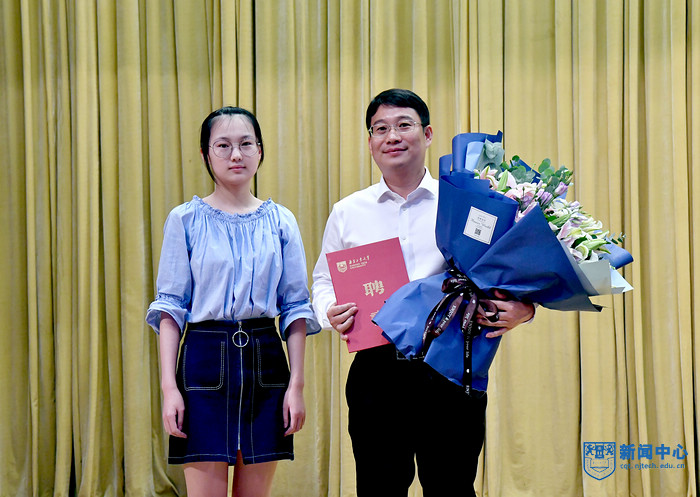 报告会开始前,学校举行了聘任陈卫国校友为思想政治理论课特聘教授仪式,乔旭校长为他颁发聘书,学生代表献花表达敬意。