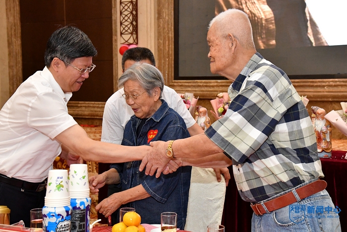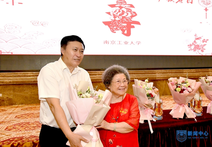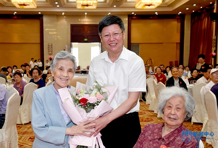 校离退休工作处处长高树军宣读了老寿星名单,芮鸿岩书记、乔旭校长为90岁老寿星赠送了鲜花,校相关职能部门负责人及部分学院领导等为80岁寿星们送上瓷寿星并表达了生日祝福和美好祝愿。