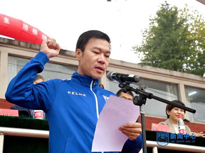江苏省第二十届运动会女子800米、3000米障碍赛两枚金牌获得者、经济与管理学院工商2106班陈慧婷同学和国际级裁判、体育学院解鑫老师分别代表全体运动员和裁判员宣誓。