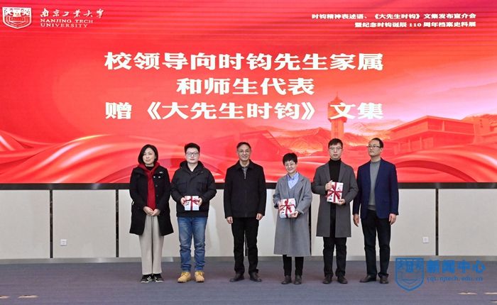 党委副书记吴胜红,副校长刘大卫、戴志晖向时钧先生亲属代表林昀,化工学院教师谈朋、硕士研究生郑龙赠送《大先生时钧》文集。党委宣传部克服时间紧、任务重的困难,在化工学院、档案馆等单位的支持下,编选了近20万字的文集,首次梳理出时钧先生年谱、增列了时钧先生可查询的学术论文等科研成果。