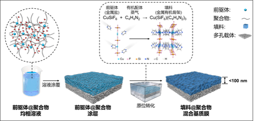 相比传统分离技术,膜分离具有能耗低和环境友好等优势。将高性能无机填料掺杂在聚合物中制备混合基质膜,有望突破膜渗透性和选择性的制约关系,成为近年来国际研究前沿。然而,混合基质膜仍未大规模应用,面临填料团聚和界面缺陷的重大挑战,如何制备超薄超高掺杂的无缺陷混合基质膜是学术界和产业界一直以来追求的梦想。金万勤教授团队是国际上较早开展混合基质膜研究的团队之一,基于持续多年的研究积累以及对关键科学问题的深入理解,他们跳出传统思维模式,提出“固态溶剂法”制备混合基质膜(图1)。区别于传统的“合成填料—分散填料—填料与聚合物混合”制备混合基质膜的复杂工艺,该方法仅需在聚合物中溶解高含量前驱体而后通过原位转化即可实现高含量填料的均匀超薄化掺杂,同时构造了以填料为主体相的新型混合基质膜结构,填料之间形成的贯穿孔道为分子提供超快传输通道。