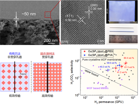 实验结果表明,基于超薄膜层和填充的贯穿筛分孔道,该混合基质膜表现出类无机膜的优异分离性能,氢气/二氧化碳分离性能高出现有聚合物膜和混合基质膜1~2个数量级(图2),在燃烧前碳捕集等过程极具应用潜力,有望助力我国双碳战略目标的实施。“固态溶剂法”主要依靠聚合物膜的加工制备技术,因此易于放大制备。目前,团队在国家重点研发项目的资助下,正在开展混合基质膜的放大制备与应用技术研究。