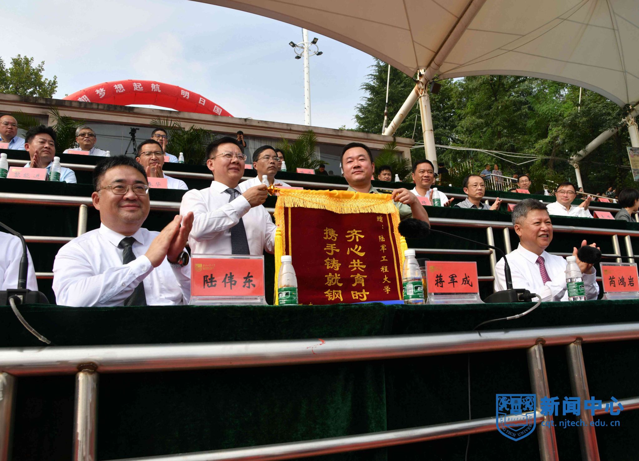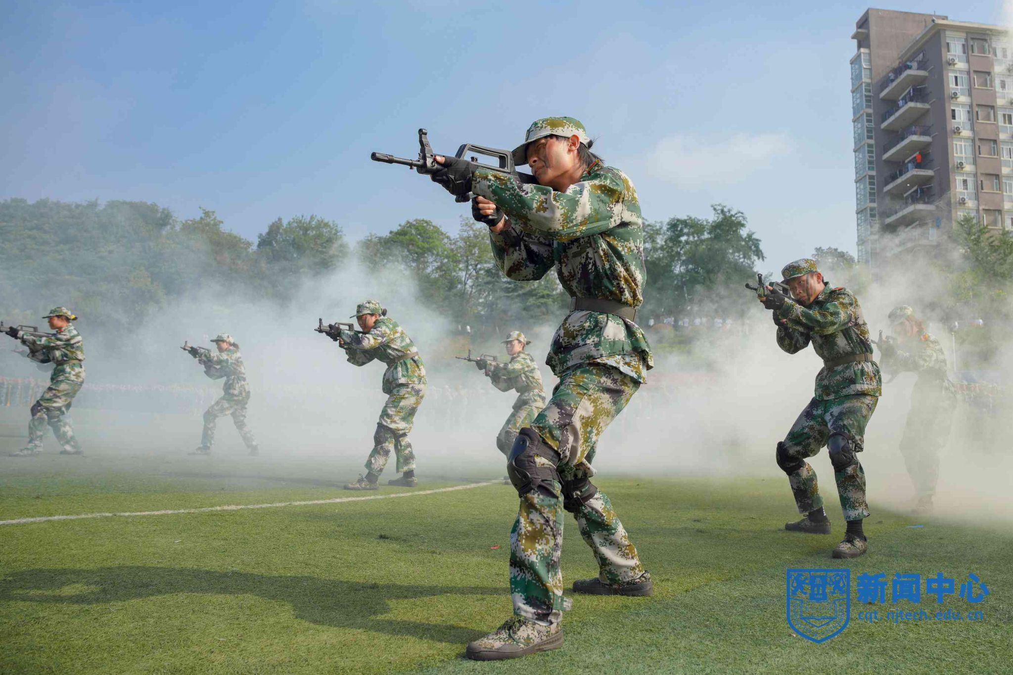 上午八时三十分,在升国旗仪式后,军训汇报表演正式开始。芮鸿岩为退伍大学生代表佩戴光荣返校绶带。在进行的分列式表演中,2023级本科新生组成十个方阵,精神饱满、队列整齐地通过主席台,充分展示了青春激扬的风采。随后,2023级新生们分别进行了打鼓舞旗、舞蹈、军体拳、盾棍术、匕首操、战术、刺杀操等表演。汇报表演结束后,主席台前排领导为“优秀教官”“优秀学员”等军训先进集体和先进个人代表颁奖。学生代表向承训教官代表献花致谢,蒋军成向承训部队赠送锦旗。