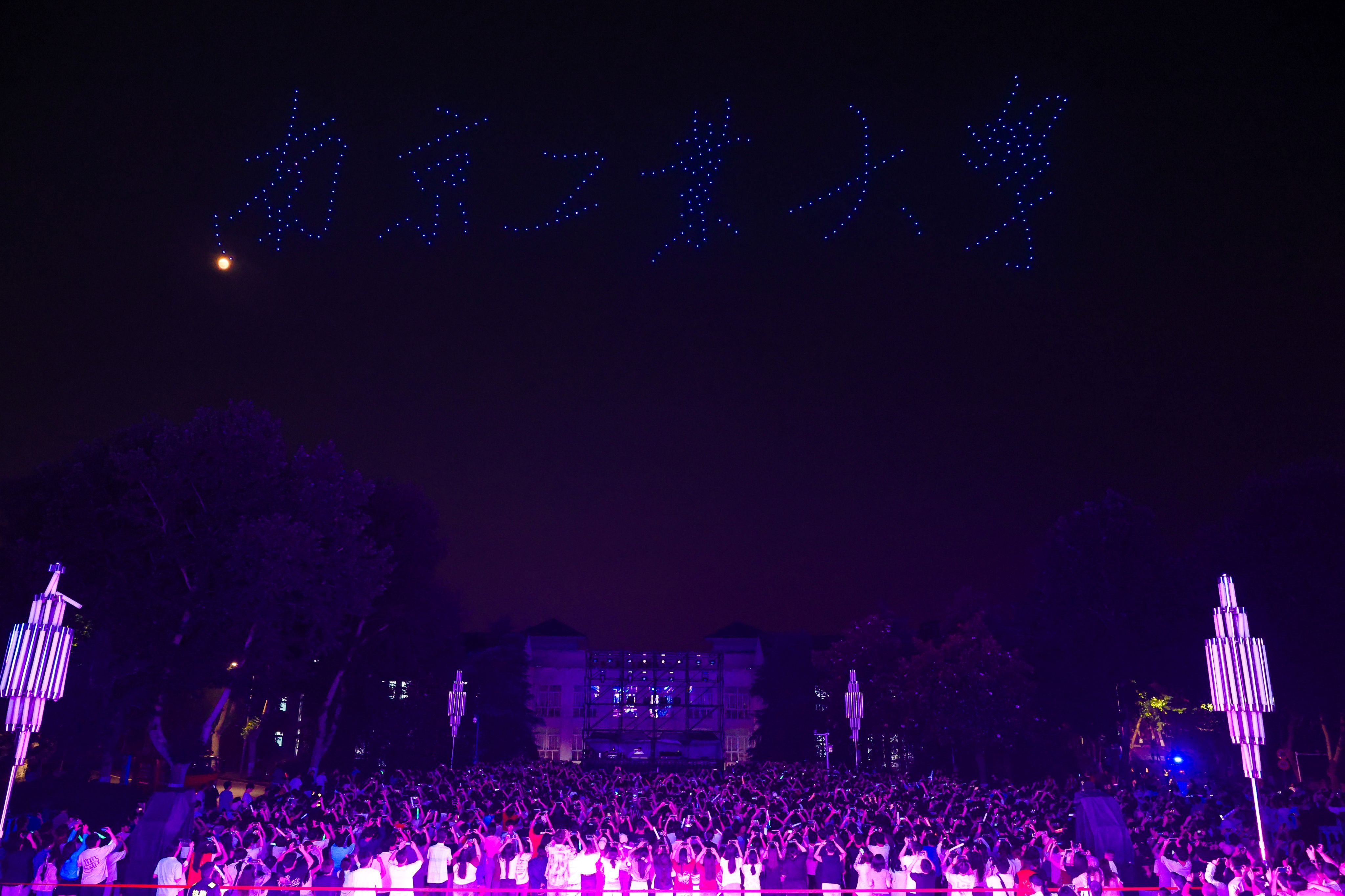 活动开始,激光穿透暮色,在震撼的音乐中勾勒天宝阁轮廓,千束灯光在空中变幻上演一场炫酷的激光秀;弦乐会悠扬浪漫的曲调、校园歌手活力动情的歌声在夜空中飘荡,让大家共同回忆与同学朝夕相处的青春时光;活动尾声,数百架无人机排列夜空,依次呈现校徽、校训及祝福词语,让夜空成为青春的留言板:“我爱南工大”“未来是星辰大海”等艺术字体在夜空中闪耀,诉说着毕业生对母校的眷恋、传递着学校对毕业生的最深挚的祝福。最后,当天空中出现“我们在更高处见”巨大字幕,毕业生将所有的离愁别绪,融入璀璨的光影、融入千人的合唱歌声,化作与母校的最炽热约定,自信勇敢奔赴未来。