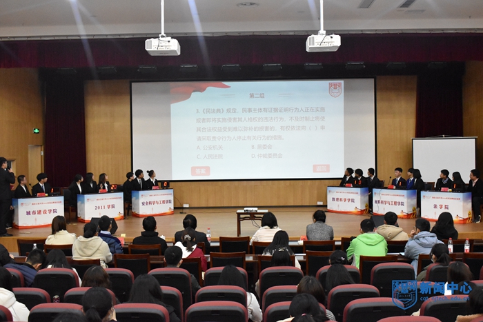 本届民法典知识竞赛共有22个学院代表队参加,经过初赛,2011学院、安全科学与工程学院、城市建设学院、数理科学学院、法学院、材料科学与工程学院等6支队伍成功晋级。决赛分为必答题、抢答题、风险题三个环节。选手们精神昂扬,认真听题,仔细思考,场上比分交错上升。紧张比赛期间,法学院笃行法律援助部带来了情景剧《民法典与小智的一生》,让观众们在轻松欢快的氛围里了解到民法典和每个人的生活息息相关。最终,数理科学学院代表队获得冠军。