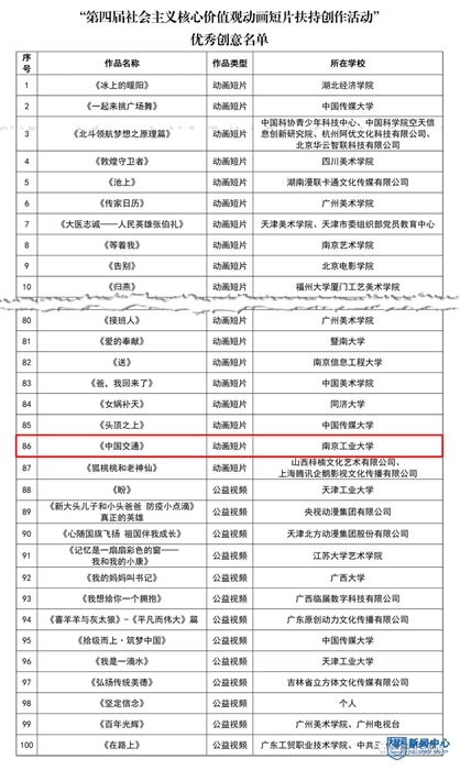 12月14日,国家广电总局与教育部高等学校动画、数字媒体专业教学指导委员会发布了“我和我的祖国——第四届社会主义核心价值观动画短片扶持创作活动”百部入围作品名单。由艺术设计学院陈岑老师指导数媒1601班盛志强、徐家卓共同创作的《中国交通》入围。