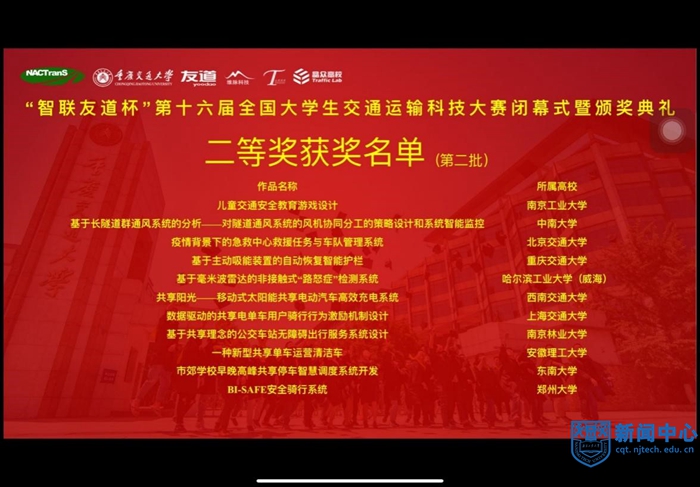 本届大赛共收到170所高校1130件作品,根据大赛章程及本届大赛实施方案,经大赛组委会审定,确定了85所高校共计184件作品进入决赛。由于疫情原因,南京高校参赛选手比赛为线上汇报,其他高校参赛选手则为线下汇报。交通学院学生团队克服重重困难,顺利地完成了线上答辩,其中由马泽超、甄云竹、曹越、杨欣鸽、闫琦若等主持的“儿童交通安全教育游戏设计”项目荣获大赛二等奖,成为交通学院目前在该项大赛中取得的历史最好成绩;由徐浩、陈航、刘轩志、申薇、高清清等主持的“视障人士智能交通出行系统“项目荣获大赛三等奖。