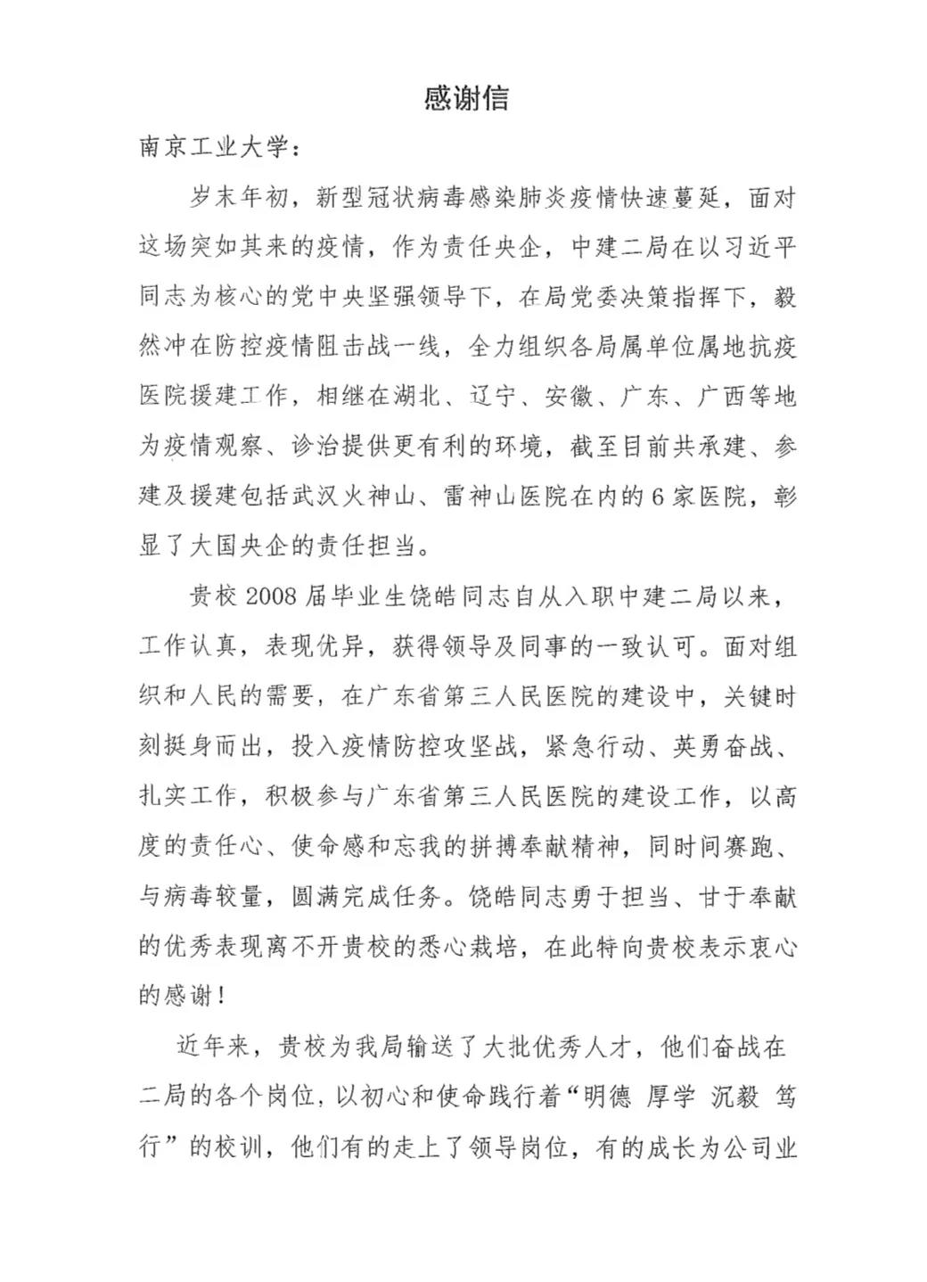 饶皓校友平时工作认真,表现优异,获得领导及同事的一致认可。在抗击新冠肺炎疫情的关键时刻,他挺身而出,积极参与广东省第三人民医院的建设,以高度的责任心、使命感和忘我的拼搏奉献精神,圆满完成任务。日前,中建二局向米兰发来感谢信。