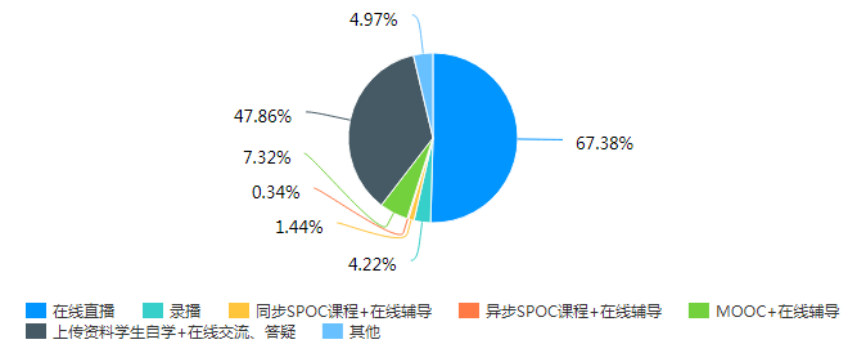 按照“推迟开学不停学”的要求,研究生院和各研究生课程教学单位,统筹制定和实施研究生课程网络教学实施方案,一课一方案,采用线上线下混合教学或学生自学与教师在线答疑等模式。承担研究生课程的老师积极创新教学方法,完善教学设计,充分利用各种线上教学平台和线上课程资源,重新规划课程线上(或自学)线下学习的学时比例和成绩评定方案,确保春季学期研究生课程教学保质有序地开展。经统计,在线教学课程采用的授课方式及在线教学平台如图1和图2所示。