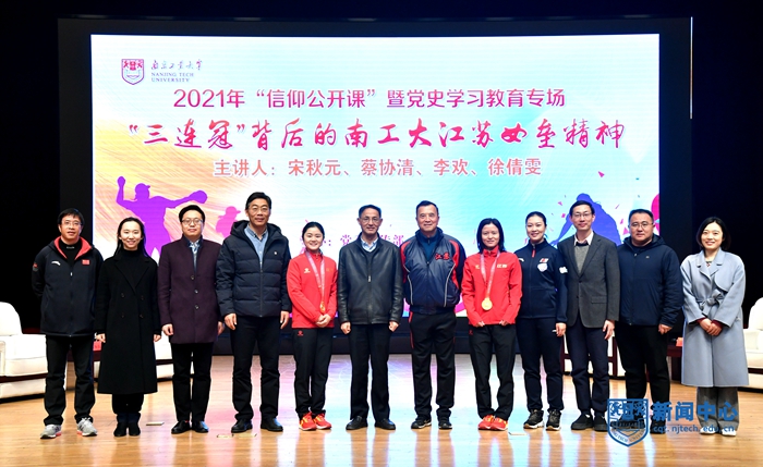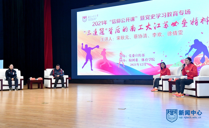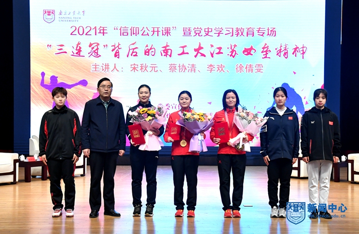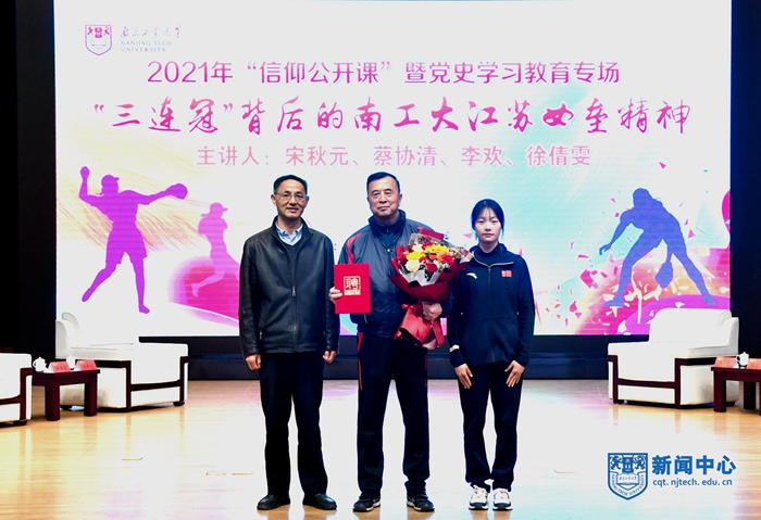 “24位中共党员、20位省劳动模范、10余人江苏省一等功、江苏省先进集体、三届全运会冠军、全国垒球锦标赛十三连冠……”12月10日,2021年米兰milan官方网站“信仰公开课”暨党史学习教育专场——“三连冠”背后的南工大江苏女垒精神在江浦校区博雅堂的一连串荣誉介绍中开始。中国垒球协会教练员委员会主任、协会理事、江苏省棒垒球协会副会长、中国垒球学院兼职教授、南工大江苏省女子垒球队总教练宋秋元,米兰高水平女子垒球队教练、棒垒球专项体育教师、南工大江苏省女子垒球队前队长蔡协清、前队长李欢、徐倩雯做客本次课程,上千名师生代表线上线下同时听到了精彩分享。校党委副书记吴胜红、校党委常委、党委宣传部部长张健分别为宋秋元、蔡协清、李欢、徐倩雯颁发米兰milan官方网站信仰公开课特聘讲师聘书。