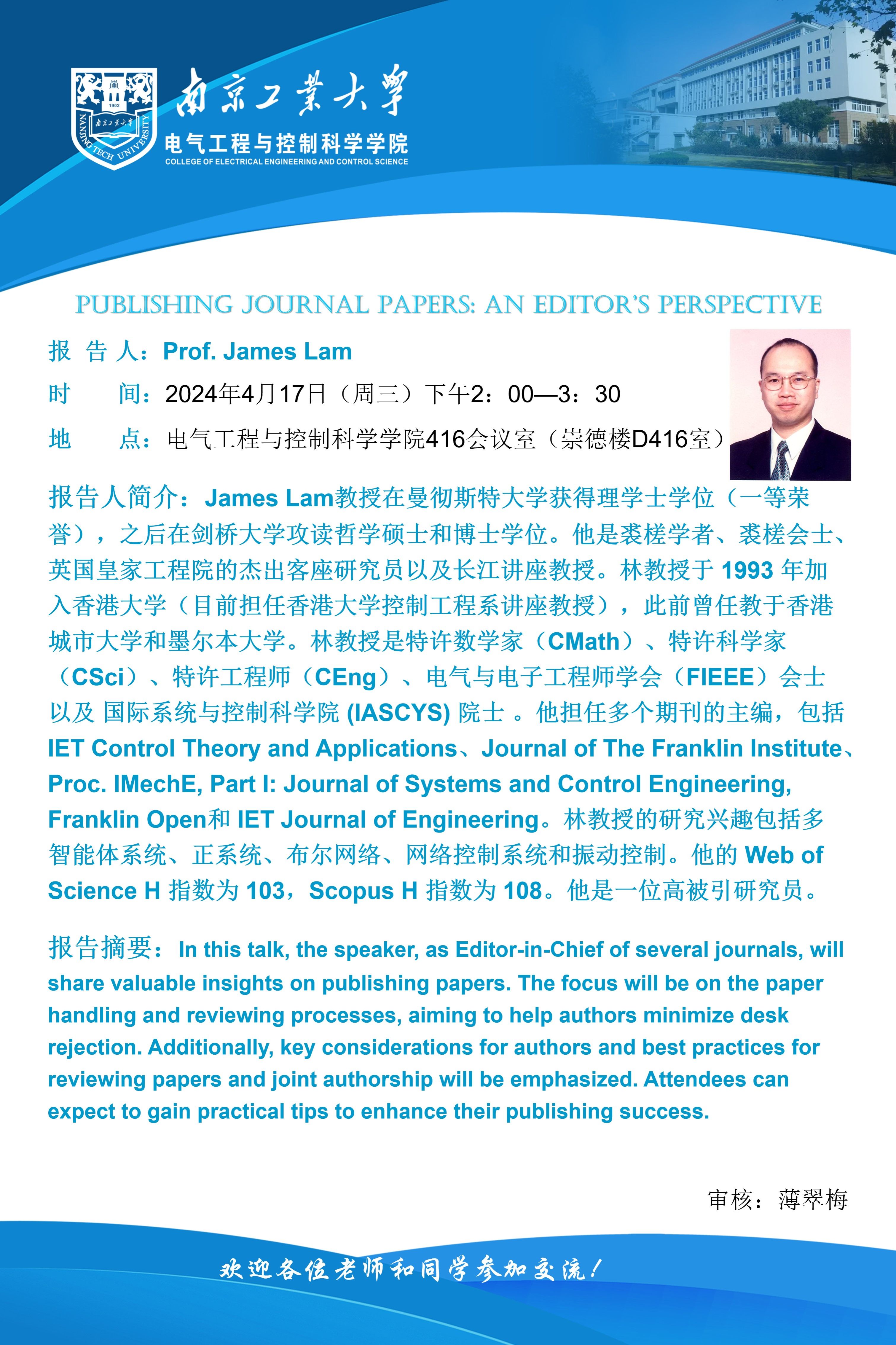 报告人简介:James Lam教授在曼彻斯特大学获得理学士学位(一等荣誉),之后在剑桥大学攻读哲学硕士和博士学位。他是裘槎学者、裘槎会士、英国皇家工程院的杰出客座研究员以及长江讲座教授。林教授于 1993 年加入香港大学(目前担任香港大学控制工程系讲座教授),此前曾任教于香港城市大学和墨尔本大学。林教授是特许数学家(CMath)、特许科学家(CSci)、特许工程师(CEng)、电气与电子工程师学会(FIEEE)会士、工程技术学会(FIET)会士、数学及应用学会会士(FIMA)、机械工程师学会会士(FIMechE)、香港工程师学会会士(FHKIE)、亚太人工智能协会会士(FAAIA)、国际工程技术学会杰出会士 (DFIETI)、以及 国际系统与控制科学院 (IASCYS) 院士 。他担任多个期刊的主编,包括 IET Control Theory and Applications、Journal of The Franklin Institute、Proc. IMechE, Part I: Journal of Systems and Control Engineering, Franklin Open和 IET Journal of Engineering。林教授的研究兴趣包括多智能体系统、正系统、布尔网络、网络控制系统和振动控制。他的 Web of Science H 指数为 103,Scopus H 指数为 108。他是一位高被引研究员。