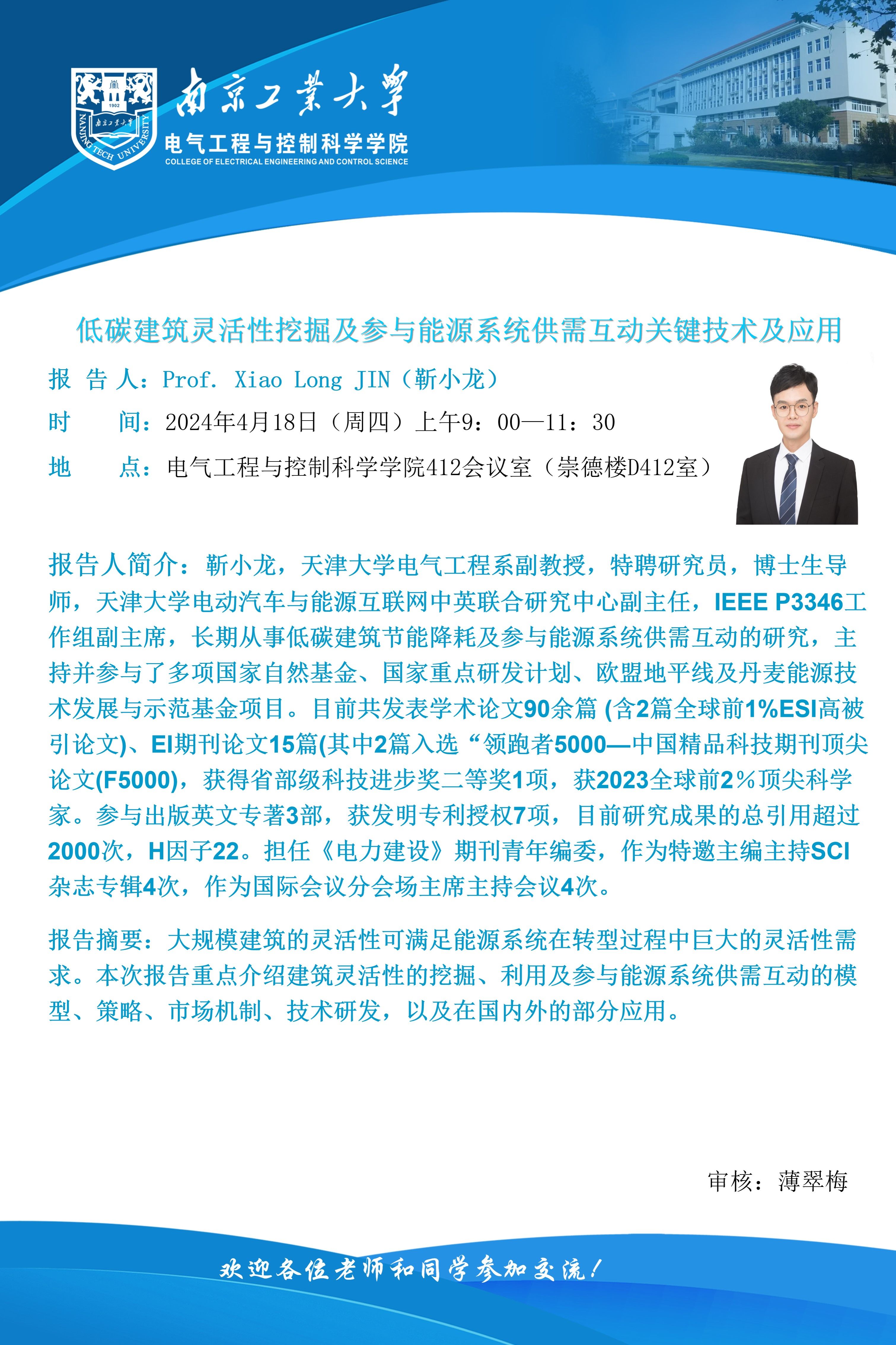 报告人简介:靳小龙,天津大学电气工程系副教授,特聘研究员,博士生导师,天津大学电动汽车与能源互联网中英联合研究中心副主任,IEEE P3346工作组副主席,长期从事低碳建筑节能降耗及参与能源系统供需互动的研究,主持并参与了多项国家自然基金、国家重点研发计划、欧盟地平线及丹麦能源技术发展与示范基金项目。目前共发表学术论文90余篇 (含2篇全球前1%ESI高被引论文)、EI期刊论文15篇(其中2篇入选“领跑者5000—中国精品科技期刊顶尖论文(F5000),获得省部级科技进步奖二等奖1项,获2023全球前2%顶尖科学家。参与出版英文专著3部,获发明专利授权7项,目前研究成果的总引用超过2000次,H因子22。担任《电力建设》期刊青年编委,作为特邀主编主持SCI杂志专辑4次,作为国际会议分会场主席主持会议4次。