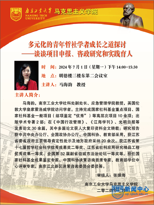 报告人简介:马海韵,米兰milan官方网站社科处副处长、应急管理学院教授,英国伦敦大学皇家霍洛威学院访问学者。主持完成国家社科基金重点项目、国家社科基金一般项目(结项鉴定“优秀”)等高层次项目10余项;出版学术专著2部;在《中国行政管理》、《江海学刊》、光明日报等发表论文30余篇,其中多篇论文获人大复印资料全文转载;研究报告获中共中央办公厅、全国政协办公厅、中国科协、教育部采用,获江苏省委省政府主要领导肯定性批示及地方政府采纳20余次。获江苏省第十七届哲学社会科学优秀成果奖二等奖、江苏省社科应用研究精品工程优秀成果一等奖、全国第32届副省级城市法治论坛一等奖等。担任国家社科基金成果鉴定专家、中国科协决策咨询首席专家、教育部学位中心评审专家、南京江北新区决策咨询委员会委员等。