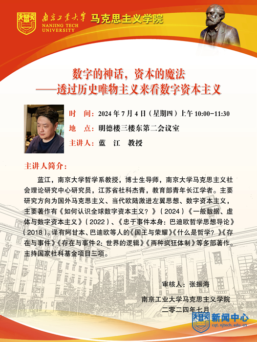 报告人简介:蓝江,南京大学哲学系教授,博士生导师,南京大学马克思主义社会理论研究中心研究员,江苏省社科杰青。主要研究方向为国外马克思主义、当代欧陆激进左翼思想、数字资本主义,主要著作有《如何认识全球数字资本主义?》(2024)《一般数据、虚体与数字资本主义》(2022)、《忠于事件本身:巴迪欧哲学思想导论》(2018)。译有阿甘本、巴迪欧等人的《国王与荣耀》《什么是哲学?》《存在与事件》《存在与事件2:世界的逻辑》《两种疯狂体制》等多部著作。主持国家社科基金项目三项。