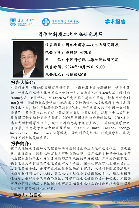 报告人简介:中国科学院上海硅酸盐研究所研究员,上海科技大学特聘教授,博士生导师。开展各种离子导体及固态电池的研究。发表学术论文460余篇,被引用20000余次,H因子80,2015-2023年爱思维尔高被引学者,授权发明专利100余项,研制的大容量钠硫电池和高安全性钠镍电池技术填补了两项我国的技术空白,知识产权转化价值超过2亿元。研究成果入选“中国十大科技进展”,获上海市技术发明一等奖等省部级一等奖3项,获得“十二五”科技部国家计划执行突出贡献奖。2009年获国务院政府特殊津贴,2016年入选亚太材料科学院院士,现任亚洲固态离子学会主席,中国硅酸盐学会常务理事,固态离子学分会理事长等职,任EER、SusMat、Ionics、Energy Materials,J.Matereiomics等编委,储能科学与技术、硅酸盐学报、陶瓷学报等副主编或编委等。