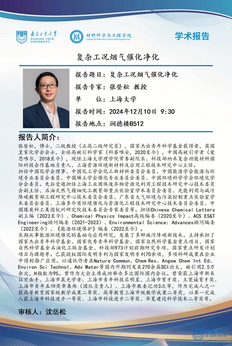 报告人简介:张登松,博士,二级教授(正高二级研究员),国家杰出青年科学基金获得者,英国皇家化学会会士,全球高被引科学家(科睿唯安,2020至今),中国高被引学者(爱思唯尔,2018至今),现任上海大学理学院常务副院长、科技部纳米复合功能材料国际科技合作基地负责人、上海资源环境新材料及应用工程技术研究中心主任。