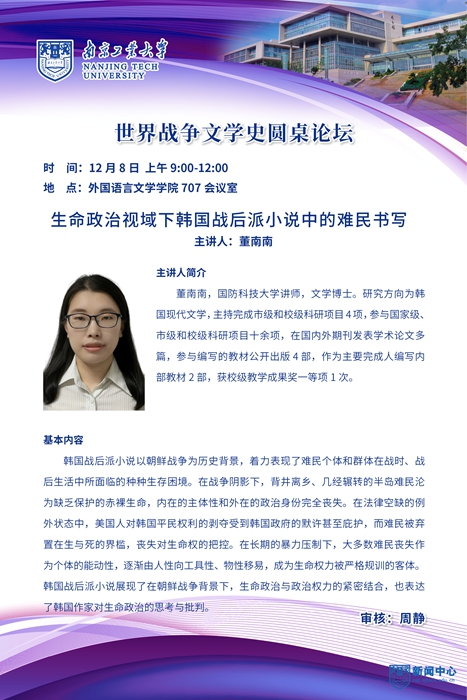 5 | 董南南 | 国防科技大学 外国语学院讲师 | 生命政治视域下韩国战后派小说中的 难民书写 |