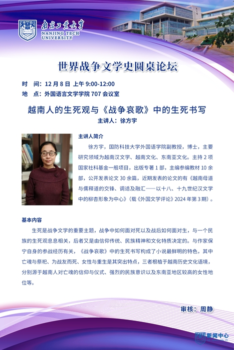 2 | 徐方宇 | 国防科技大学 外国语学院副教授 | 越南人的生死观与《战争哀歌》中的 生死书写 |