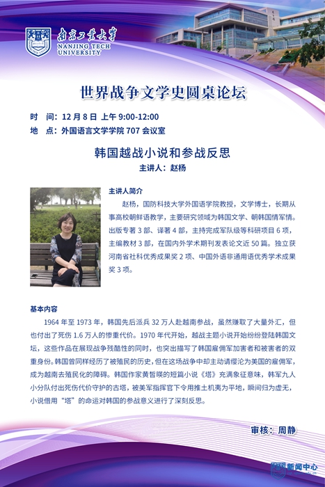1 | 赵杨 | 国防科技大学 外国语学院教授 | 韩国越战小说和参战反思 |