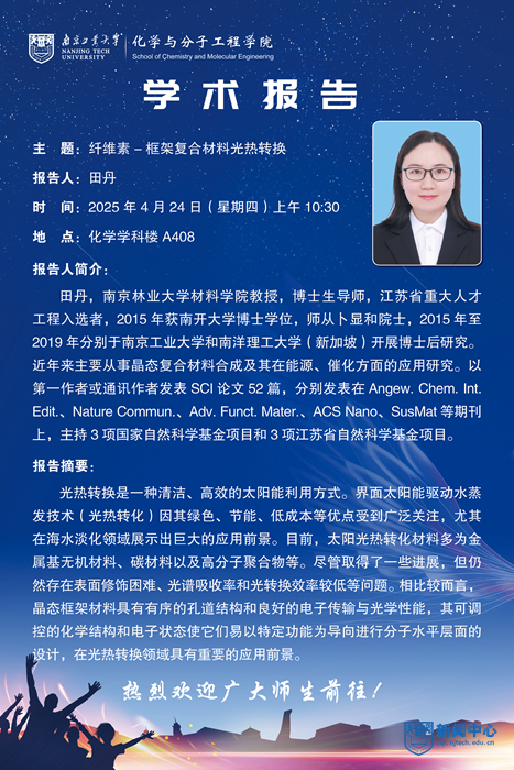 报告人简介:田丹,南京林业大学材料学院教授,博士生导师,江苏省重大人才工程入选者,2015年获南开大学博士学位,师从卜显和院士,2015年至2019年分别于米兰milan官方网站和南洋理工大学(新加坡)开展博士后研究。近年来主要从事晶态复合材料合成及其在能源、催化方面的应用研究。以第一作者或通讯作者发表SCI论文52篇,分别发表在Angew. Chem. Int. Edit.、Nature Commun.、Adv. Funct. Mater.、ACS Nano、SusMat等期刊上,主持3项国家自然科学基金项目和3项江苏省自然科学基金项目。