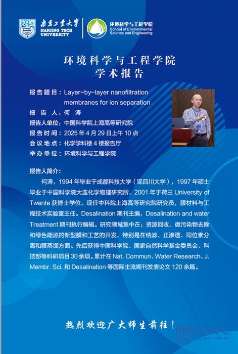 报告人简介:何涛,1994年毕业于成都科技大学(现四川大学),1997年硕士毕业于中国科学院大连化学物理研究所,2001年于荷兰University of Twente获博士学位。现任中科院上海高等研究院研究员,膜材料与工程技术实验室主任。Desalination期刊主编,Desalination and water Treatment期刊执行编辑。研究领域集中在:资源回收、微污染物去除和绿色能源的新型膜和工艺的开发,特别是在纳滤、正渗透、同位素分离和膜蒸馏方面。先后获得中国科学院、国家自然科学基金委员会、科技部等科研项目30余项。累计在Nat. Commun、Water Research、J. Membr. Sci.和Desalination等国际主流期刊发表论文120余篇。