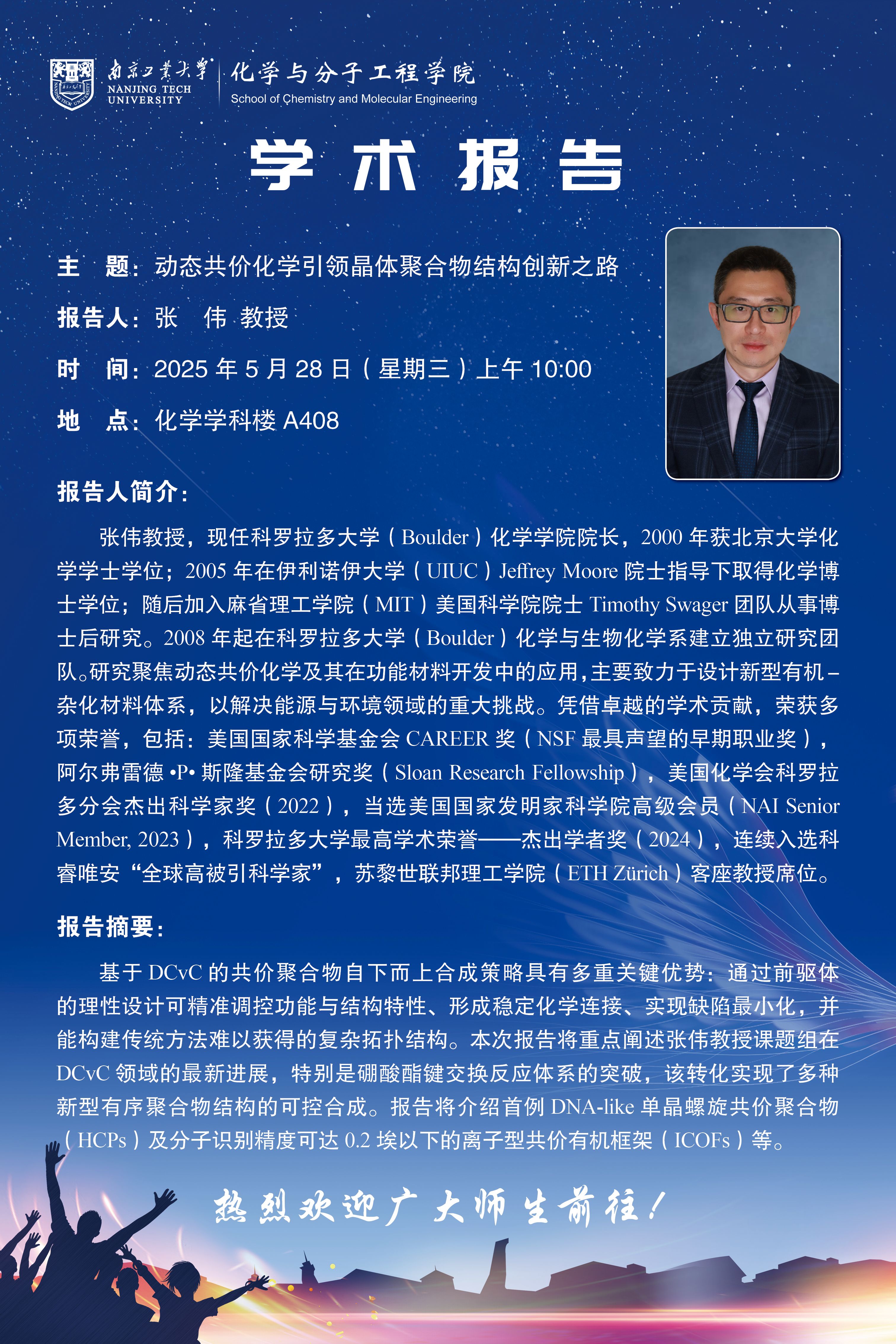报告人简介:张伟教授,现任科罗拉多大学(Boulder)化学学院院长,2000年获北京大学化学学士学位;2005年在伊利诺伊大学(UIUC)Jeffrey Moore院士指导下取得化学博士学位;随后加入麻省理工学院(MIT)美国科学院院士Timothy Swager团队从事博士后研究。2008年起在科罗拉多大学(Boulder)化学与生物化学系建立独立研究团队。研究聚焦动态共价化学及其在功能材料开发中的应用,主要致力于设计新型有机-杂化材料体系,以解决能源与环境领域的重大挑战。凭借卓越的学术贡献,荣获多项荣誉,包括:美国国家科学基金会CAREER奖(NSF最具声望的早期职业奖),阿尔弗雷德•P•斯隆基金会研究奖(Sloan Research Fellowship),美国化学会科罗拉多分会杰出科学家奖(2022),当选美国国家发明家科学院高级会员(NAI Senior Member, 2023),科罗拉多大学最高学术荣誉——杰出学者奖(2024),连续入选科睿唯安“全球高被引科学家”,苏黎世联邦理工学院(ETH Zürich)客座教授席位。