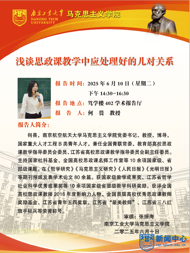 报告人简介:何畏,南京航空航天大学马克思主义学院党委书记、教授、博导,国家重大人才工程B类青年人才,兼任全国青联常委、教育部高校思政课教学指导委员会委员、江苏省高校思政课教学指导委员会副主任委员。主持国家社科基金、全国高校思政课名师工作室等10余项国家级、省部级课题。在《哲学研究》《马克思主义研究》《人民日报》《光明日报》等期刊报纸发表学术论文80余篇。获国家级教学成果奖、江苏省哲学社会科学优秀成果奖等10余项国家级省部级教学科研奖励,获评全国高校思政课教师2016年度影响力人物、全国首届高校优秀思政课教师奖励基金、江苏省青年五四奖章、江苏省“最美教师”、江苏省三八红旗手标兵等荣誉称号。