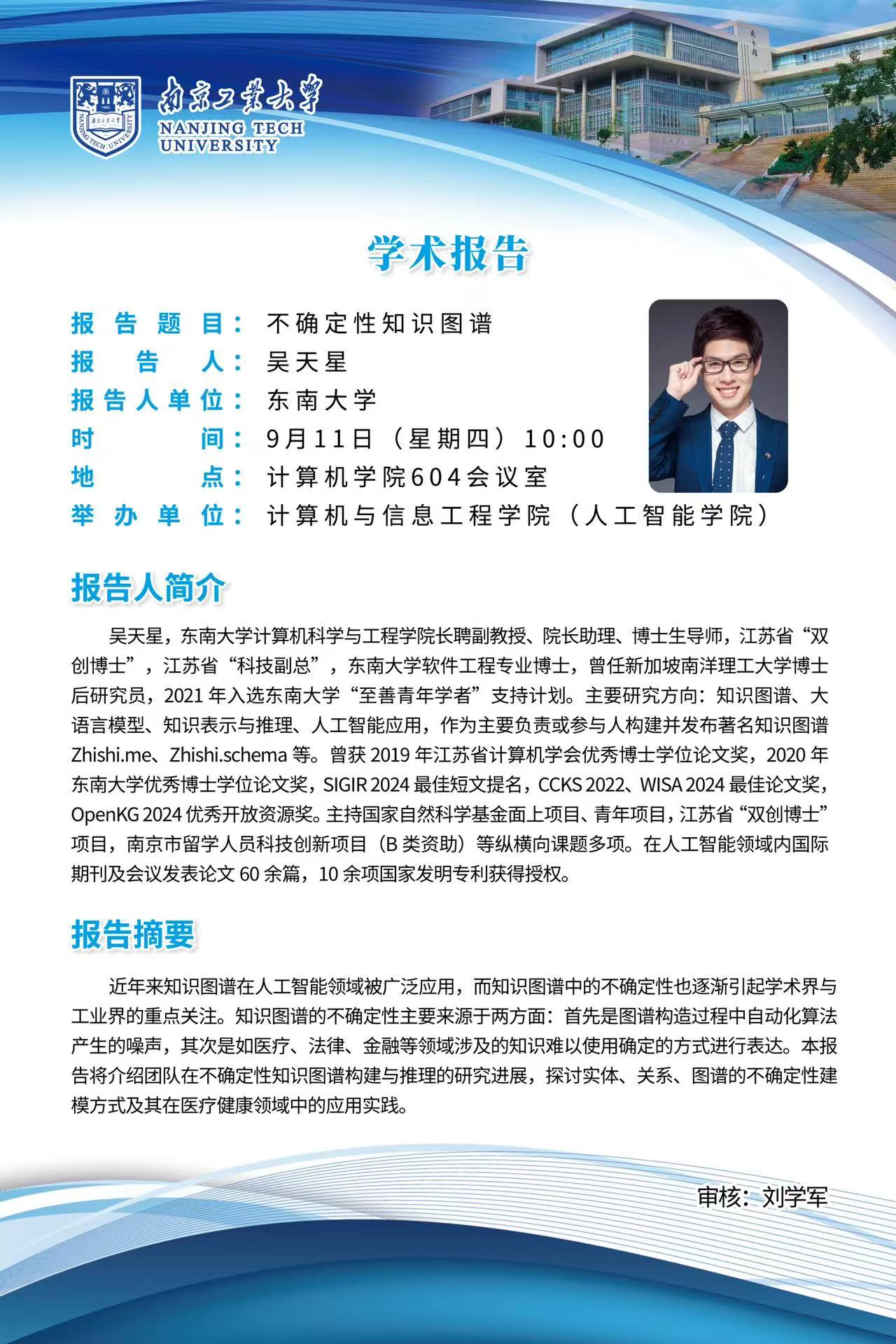 报告人简介:吴天星,东南大学计算机科学与工程学院长聘副教授、院长助理、博士生导师,江苏省“双创博士”,江苏省“科技副总”,东南大学软件工程专业博士,曾任新加坡南洋理工大学博士后研究员,2021年入选东南大学“至善青年学者”支持计划。主要研究方向:知识图谱、大语言模型、知识表示与推理、人工智能应用,作为主要负责或参与人构建并发布著名知识图谱Zhishi.me、Zhishi.schema等。曾获2019年江苏省计算机学会优秀博士学位论文奖,2020年东南大学优秀博士学位论文奖,SIGIR 2024最佳短文提名,CCKS 2022、WISA 2024最佳论文奖,OpenKG 2024优秀开放资源奖。主持国家自然科学基金面上项目、青年项目,江苏省“双创博士”项目,南京市留学人员科技创新项目(B类资助)等纵横向课题多项。在人工智能领域内国际期刊及会议发表论文60余篇,10余项国家发明专利获得授权。