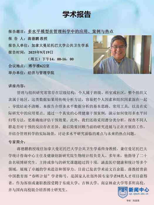 报告人简介:蒋德鹏教授现任加拿大曼尼托巴大学公共卫生学系终身教授,兼任曼尼托巴大学统计咨询中心主任及健康创新研究院生物统计组负责人。多年来,他指导了二十余名硕博研究生,主持或参与的研究课题超过四十项,涵盖医疗健康和统计等多个领域,展现了卓越的学术造诣和领导力。目前已发表学术论文百余篇。蒋教授曾获中国教育部“春晖计划”学者称号,是国家人社部外国专家学者H类人才项目获得者,作为客座或兼职教授受聘于东南大学、吉林大学、南京林业大学等多所高校,并与国内高校联合培养博士研究生。