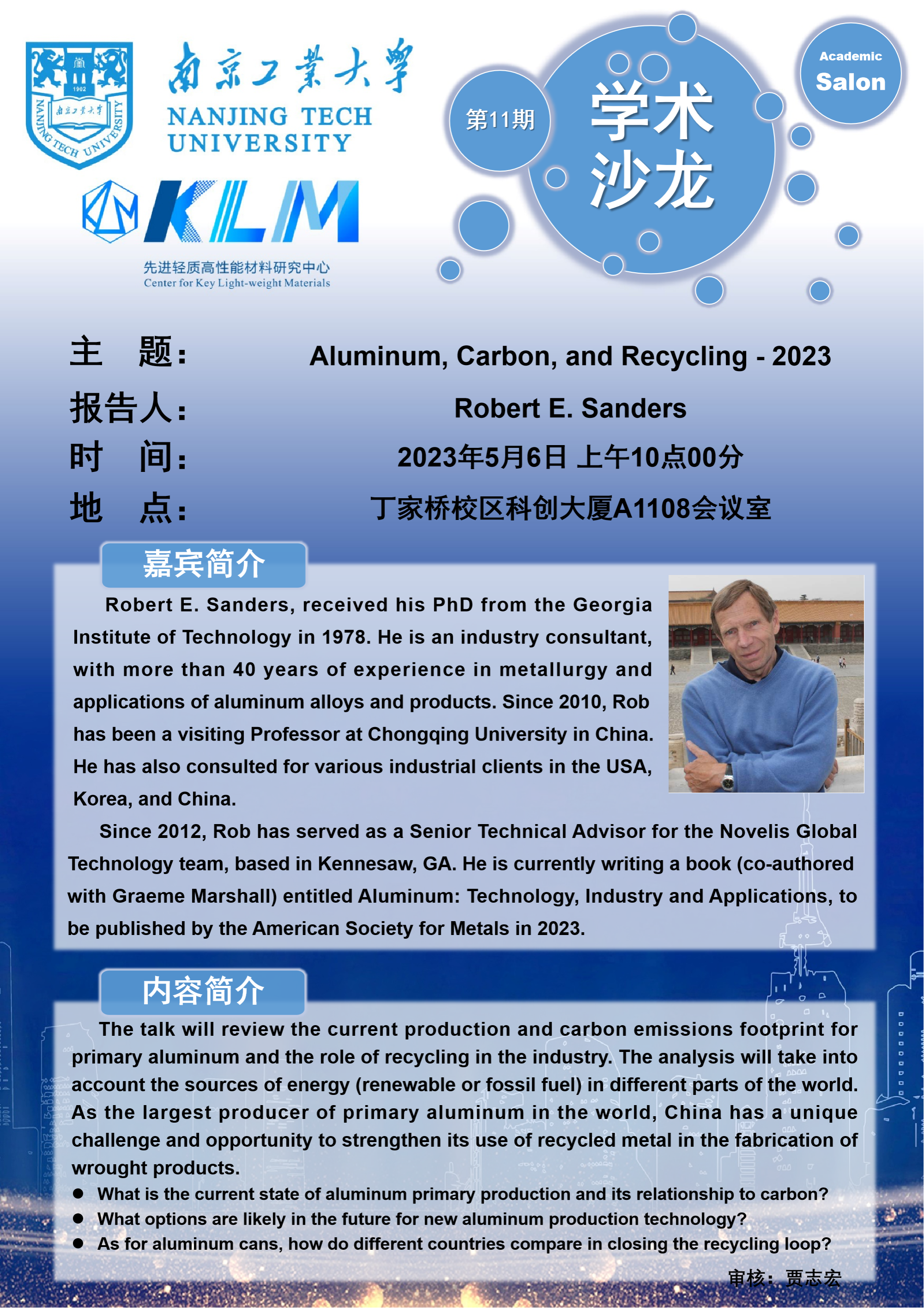 报告人简介:Robert Sanders is an industry consultant, with more than 40 years of experience in metallurgy and applications of aluminum alloys and products. Rob received his PhD in Metallurgy from the Georgia Institute of Technology in 1978 where he studied fatigue and fracture behavior of high strength aluminum alloys. He worked at theAlcoa Technical Centerin aluminum alloy research and development, technology transfer from R&D to manufacturing, and education and training from 1978 until 2011. His experience includes aluminum can sheet, aerospace and automotive products, armor plate, foil, continuous casting, and extrusions. From 2005-2010 Rob was theTechnology Director for Alcoa Asia-Pacific in Beijing, where he hired and trained a 10 person technical team to support Alcoa’s business in China. Since 2010, Rob has been a visiting Professor atChongqing University in China. He supervises several students in various aspects of microstructure and mechanical behavior of aluminum alloys and teaches a general class in aluminum metallurgy. He has also consulted for various industrial clients in the USA, Korea, and China.