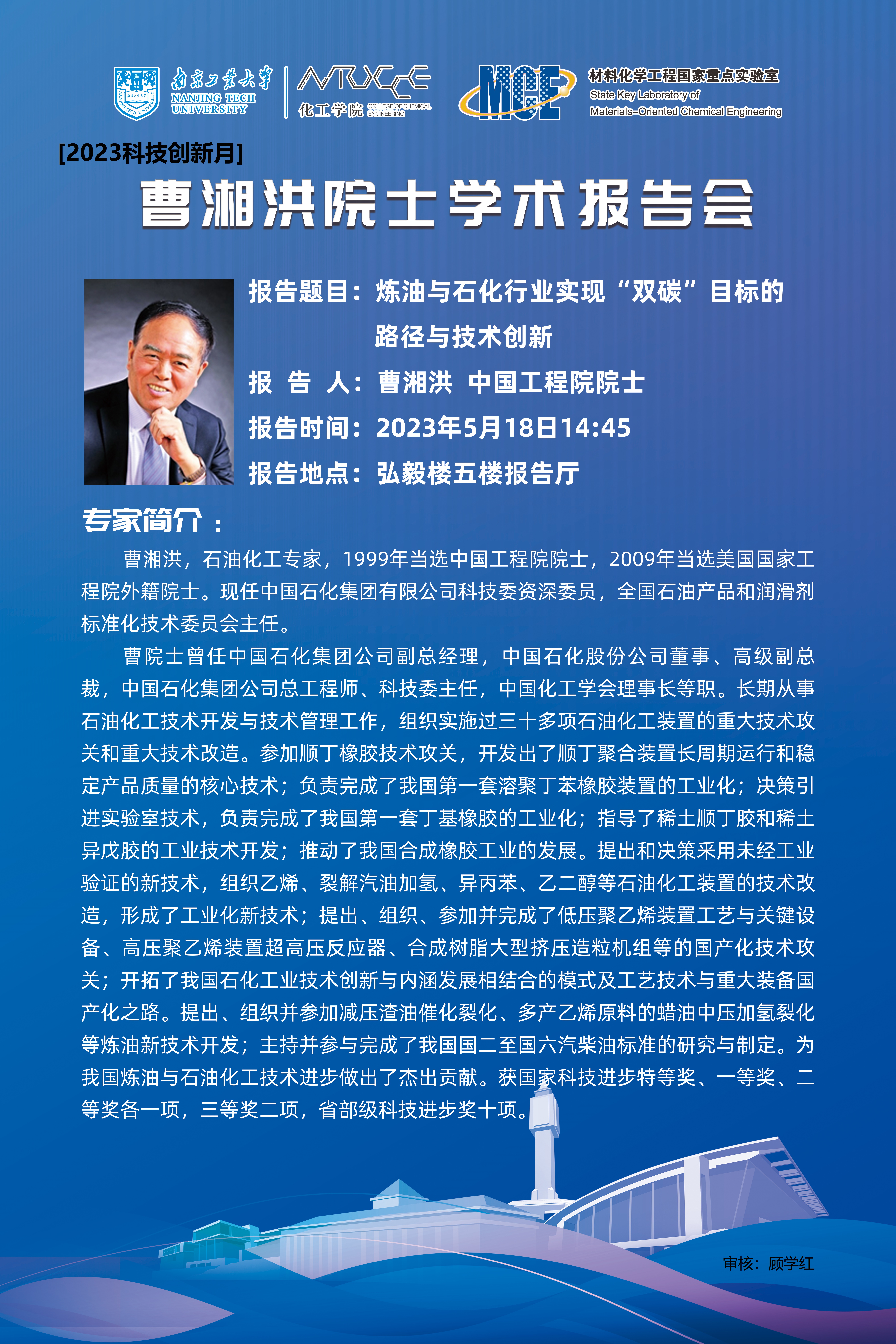 报告人简介:曹湘洪,石油化工专家,1999年当选中国工程院院士,2009年当选美国国家工程院外籍院士。现任中国石化集团有限公司科技委资深委员,全国石油产品和润滑剂标准化技术委员会主任。