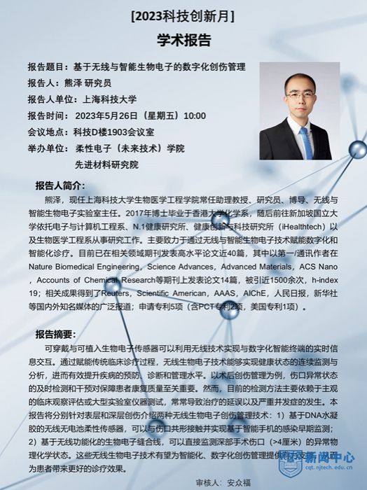 报告人简介:熊泽,现任上海科技大学生物医学工程学院常任助理教授、研究员、博导、无线与智能生物电子实验室主任。2017年博士毕业于香港大学化学系,随后前往新加坡国立大学依托电子与计算机工程系、N.1健康研究所、健康创新与科技研究所(iHealthtech)以及生物医学工程系从事研究工作。主要致力于通过无线与智能生物电子技术赋能数字化和智能化诊疗。目前已在相关领域期刊发表高水平论文近40篇,其中以第一/通讯作者在Nature Biomedical Engineering,Science Advances,Advanced Materials,ACS Nano,Accounts of Chemical Research等期刊上发表论文14篇,被引近1500余次,h-index 19;相关成果得到了Reuters,Scientific American,AAAS,AIChE,人民日报,新华社等国内外知名媒体的广泛报道;申请专利5项(含PCT专利2项,美国专利1项)。