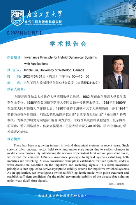 报告人简介:刘新芝教授现任加拿大滑铁卢大学应用数学系教授。1982年在山东师范大学数学系获学士学位。1988年在美国德克萨斯大学阿灵顿分校获博士学位。1988年至1990年在加拿大阿尔伯塔大学作博士后。1990年受聘于滑铁卢大学为助理教授,并于1994年被聘为该校终身教授。刘教授的研究方向包括:混合动力系统,非线性系统控制及稳定性,复杂网络的同步,通讯网络模型,传染病模型等。已发表学术论文400余篇,学术专著6部,学术编著20余部。