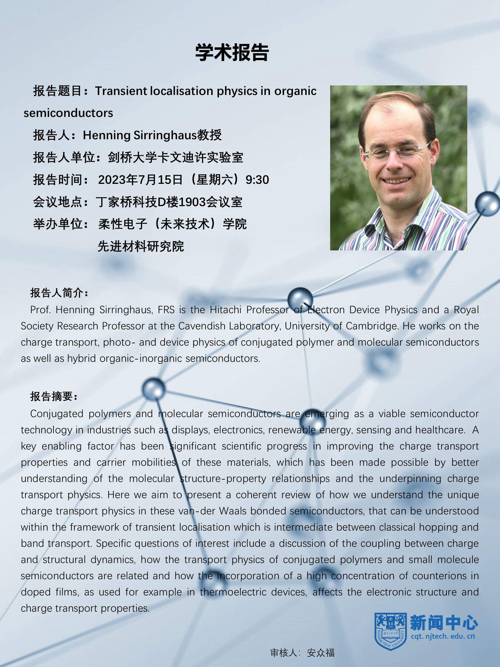 报告人简介:Prof. Henning Sirringhaus, FRS is the Hitachi Professor of Electron Device Physics and a Royal Society Research Professor at the Cavendish Laboratory, University of Cambridge. He works on the charge transport, photo- and device physics of conjugated polymer and molecular semiconductors as well as hybrid organic-inorganic semiconductors.