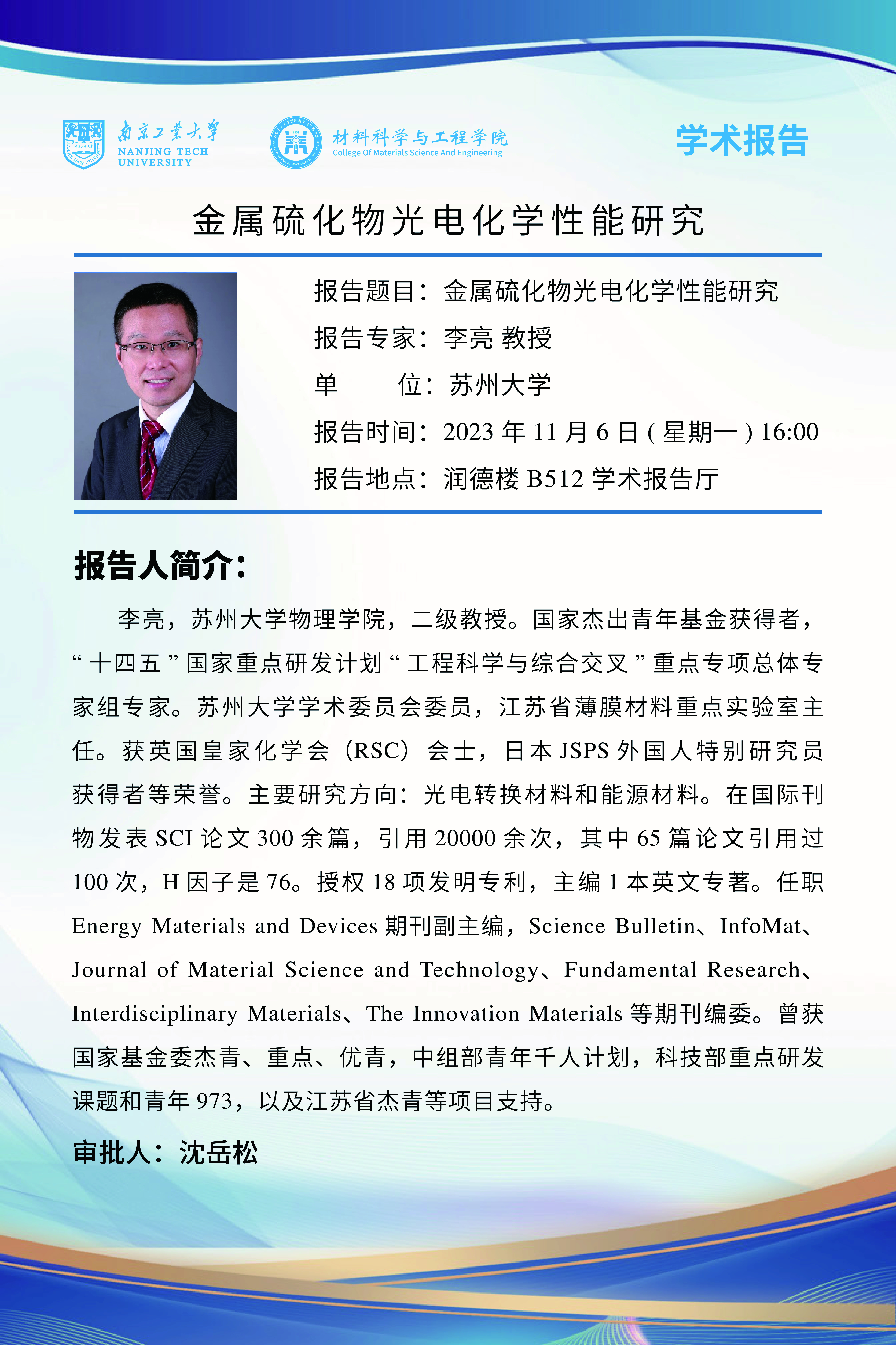 李亮,苏州大学物理学院,二级教授。国家杰出青年基金获得者,“十四五”国家重点研发计划“工程科学与综合交叉”重点专项总体专家组专家。苏州大学学术委员会委员,江苏省薄膜材料重点实验室主任。获英国皇家化学会(RSC)会士,日本JSPS外国人特别研究员获得者等荣誉。主要研究方向:光电转换材料和能源材料。在国际刊物发表SCI论文300余篇,引用20000余次,其中65篇论文引用过100次,H因子是76。授权18项发明专利,主编1本英文专著。任职Energy Materials and Devices期刊副主编,Science Bulletin、InfoMat、Journal of Material Science and Technology、Fundamental Research、Interdisciplinary Materials、The Innovation Materials等期刊编委。曾获国家基金委杰青、重点、优青,科技部重点研发课题和青年973,以及江苏省杰青等项目支持。