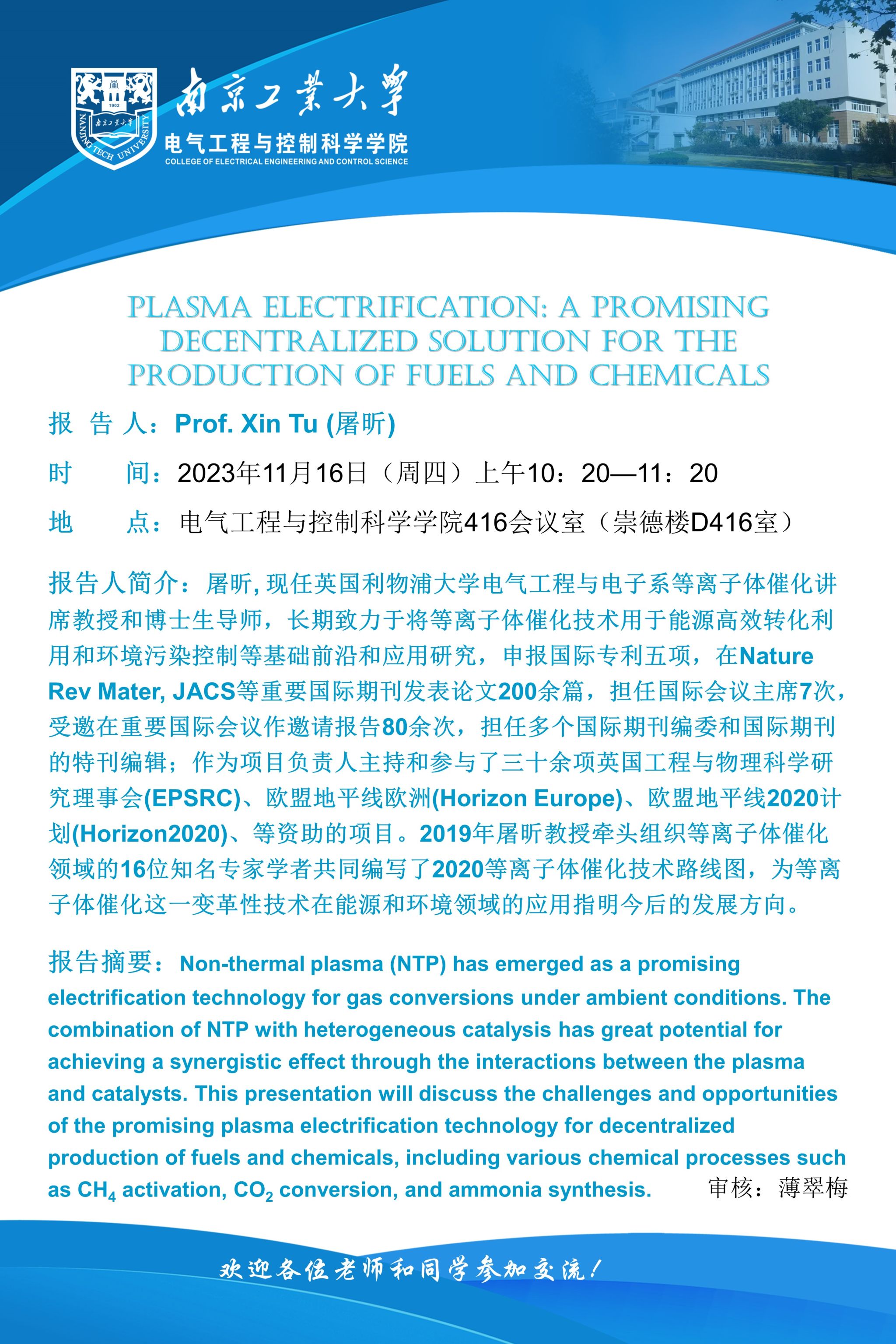 报告人简介:屠昕, 现任英国利物浦大学电气工程与电子系等离子体催化讲席教授和博士生导师。屠昕教授长期致力于将等离子体催化技术用于能源高效转化利用和环境污染控制等基础前沿和应用研究,具有多学科交叉的国际化研究背景,取得了一批具有国际领先水平的创新成果,申报国际专利五项,在Nature Rev Mater, JACS, Agnew Chem等重要国际期刊发表论文200余篇。屠昕教授是等离子体催化领域具有国际影响力的知名学者,多次举办国际会议/暑期学校并担任国际会议主席7次,受邀在重要国际会议作邀请报告80余次,担任多个国际期刊编委和国际期刊的特刊编辑。2019年屠昕教授牵头组织等离子体催化领域的16位知名专家学者共同编写了2020等离子体催化技术路线图,为等离子体催化这一变革性技术在能源和环境领域的应用指明今后的发展方向。屠昕教授作为项目负责人主持和参与了三十余项英国工程与物理科学研究理事会(EPSRC)、欧盟地平线欧洲(Horizon Europe)、欧盟地平线2020计划(Horizon2020)、皇家学会、皇家工程学会、英国文化协会、英国交通部、英国国家核实验室和工业界等资助的项目,经费总额超过1800万英镑,其中承担经费超过500万英镑。