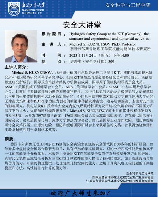 报告人简介:Michael S. KUZNETSOV,现任职于德国卡尔斯鲁厄理工学院(KIT)核能与能源技术研究所和法国燃烧研究所科学研究中心,担任KIT氢燃烧与爆轰主要研究员和实验组长、匹兹堡燃烧研究所成员、国际反应堆技术结构力学协会成员、国际原子能机构指导委员会成员、ASME(美国机械工程师学会)会员、ANS(美国核学会)会员、SIAM工业与应用数学学会会员。1985年博士毕业于Leningrad Institute of Technology。Michael S. KUZNETSOV博士目前的主要研究领域为燃烧和爆炸物理学,其中包括氢气火焰及近极限氢气火焰在薄层几何中的火焰传播机制和火焰不稳定性研究;不同几何结构中DDT的动力学和气体动力学研究;无冲击火焰加速和DDT在水力阻力驱动的明渠中传播及冲击波、边界层和湍流、紊流对其产生的影响研究;核电站及KIT反应堆安全壳内氢气燃烧特性研究及甲烷-空气混合物在不同压力和温度下的点火、火焰加速和爆震研究等。Michael S. KUZNETSOV博士目前累计授权俄罗斯发明专利3项,公开发表97篇期刊论文、176篇国际会议论文及38部出版著作。Michael S. KUZNETSOV博士曾在第七届氢安全国际会议、第九届国际传热、流体力学和热力学会议、第八届国际工业爆炸危险、预防和缓解研讨会及第四届工业爆炸危险、预防和缓解国际研讨会上荣获最佳论文奖,还曾获得燃烧和爆炸实验卓越奖和列宁卓越学术奖等。
