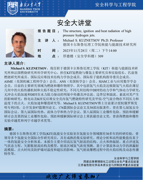 报告人简介:Michael S. KUZNETSOV,现任职于德国卡尔斯鲁厄理工学院(KIT)核能与能源技术研究所和法国燃烧研究所科学研究中心,担任KIT氢燃烧与爆轰主要研究员和实验组长、匹兹堡燃烧研究所成员、国际反应堆技术结构力学协会成员、国际原子能机构指导委员会成员、ASME(美国机械工程师学会)会员、ANS(美国核学会)会员、SIAM工业与应用数学学会会员。1985年博士毕业于Leningrad Institute of Technology。Michael S. KUZNETSOV博士目前的主要研究领域为燃烧和爆炸物理学,其中包括氢气火焰及近极限氢气火焰在薄层几何中的火焰传播机制和火焰不稳定性研究;不同几何结构中DDT的动力学和气体动力学研究;无冲击火焰加速和DDT在水力阻力驱动的明渠中传播及冲击波、边界层和湍流、紊流对其产生的影响研究;核电站及KIT反应堆安全壳内氢气燃烧特性研究及甲烷-空气混合物在不同压力和温度下的点火、火焰加速和爆震研究等。Michael S. KUZNETSOV博士目前累计授权俄罗斯发明专利3项,公开发表97篇期刊论文、176篇国际会议论文及38部出版著作。Michael S. KUZNETSOV博士曾在第七届氢安全国际会议、第九届国际传热、流体力学和热力学会议、第八届国际工业爆炸危险、预防和缓解研讨会及第四届工业爆炸危险、预防和缓解国际研讨会上荣获最佳论文奖,还曾获得燃烧和爆炸实验卓越奖和列宁卓越学术奖等。