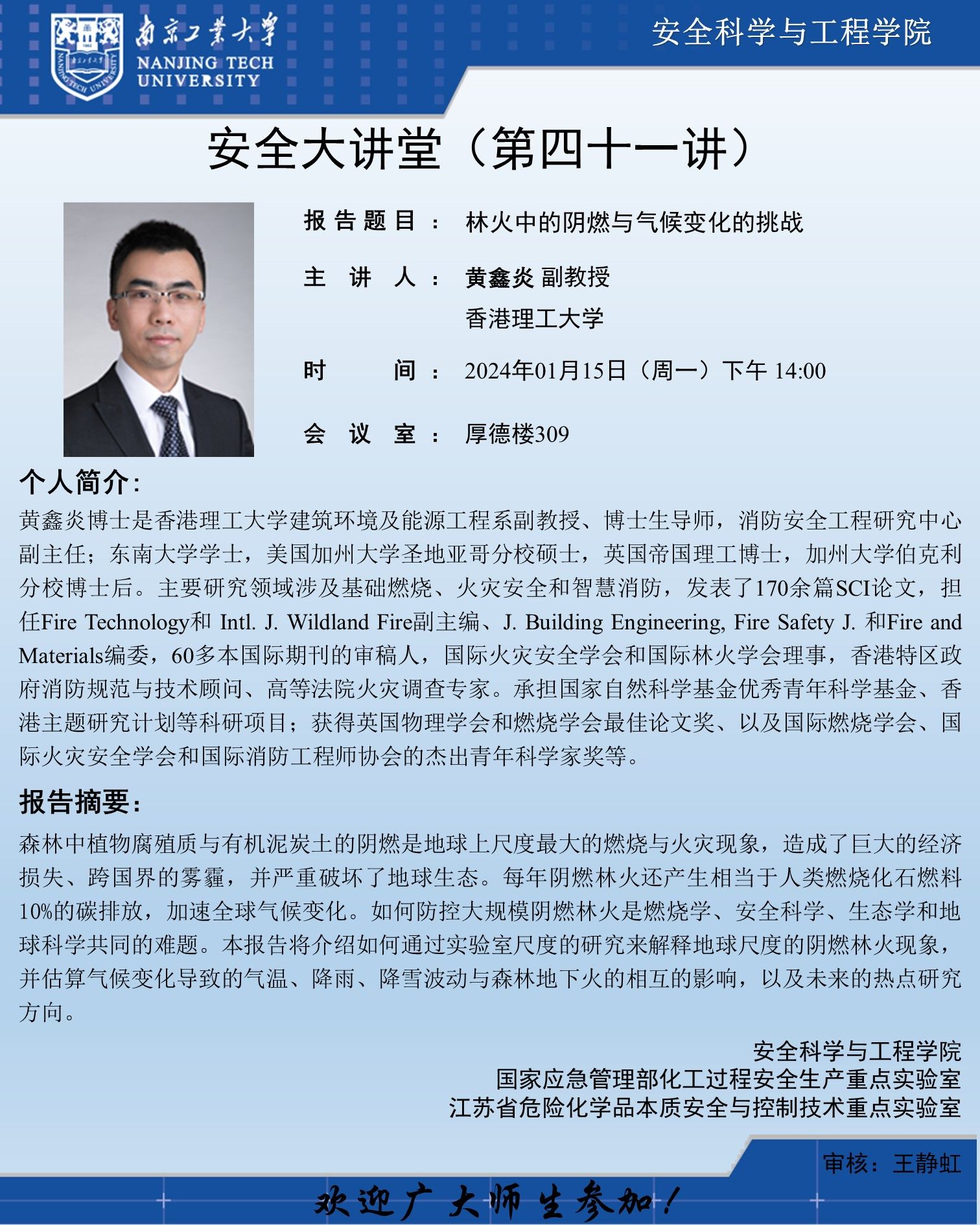 报告人简介:黄鑫炎博士是香港理工大学建筑环境及能源工程系副教授、博士生导师,消防安全工程研究中心副主任;东南大学学士,美国加州大学圣地亚哥分校硕士,英国帝国理工博士,加州大学伯克利分校博士后。主要研究领域涉及基础燃烧、火灾安全和智慧消防,发表了170余篇SCI论文,担任Fire Technology和 Intl. J. Wildland Fire副主编、J. Building Engineering, Fire Safety J. 和Fire and Materials编委,60多本国际期刊的审稿人,国际火灾安全学会和国际林火学会理事,香港特区政府消防规范与技术顾问、高等法院火灾调查专家。承担国家自然科学基金优秀青年科学基金、香港主题研究计划等科研项目;获得英国物理学会和燃烧学会最佳论文奖、以及国际燃烧学会、国际火灾安全学会和国际消防工程师协会的杰出青年科学家奖等。