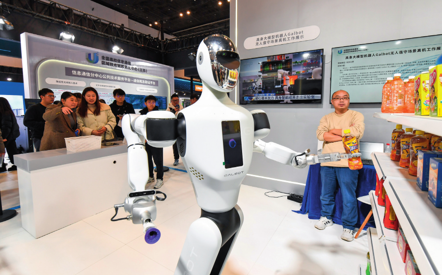 参观者在中国高校 科技成果交易会上观看 展出的自动售货机器人 (2024 年 12 月 26 日摄) 杨素平摄 / 本刊