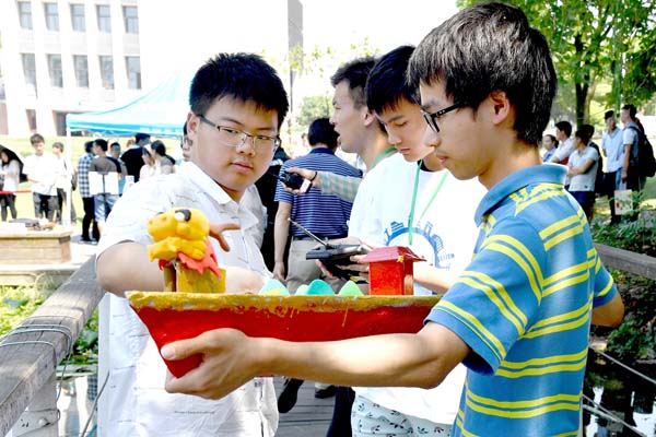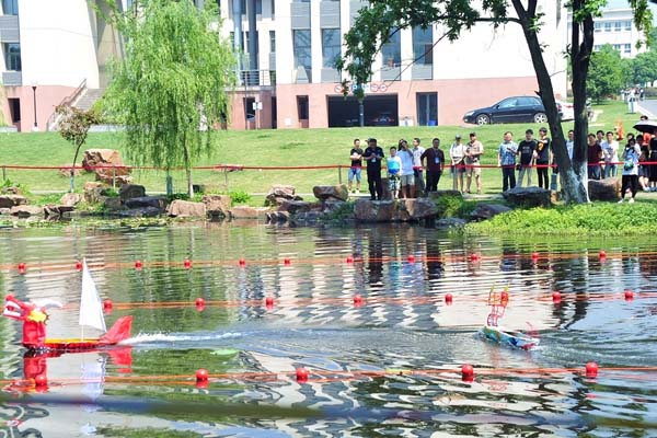 “龙行天下”“惟我独尊”“舍我其谁”……只见一尾尾用或明黄或朱红装裱得精美的龙舟在南工君子湖用浮标所规划出的航道上,劈波斩浪,湖里的小船冲锋向前,岸上的主人紧张有序地遥控着小船直行、左转、右拐、后退。