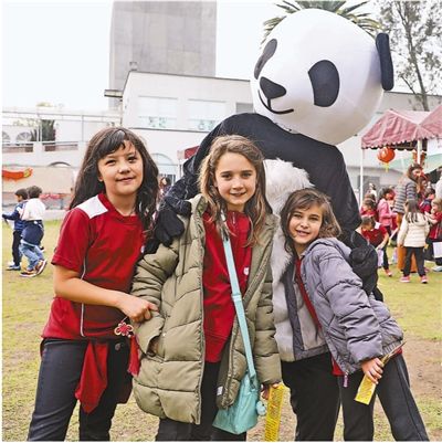 1月24日,在墨西哥城孔子学院举办的春节活动上,3个小朋友和1名学生家长扮演的大熊猫合影。