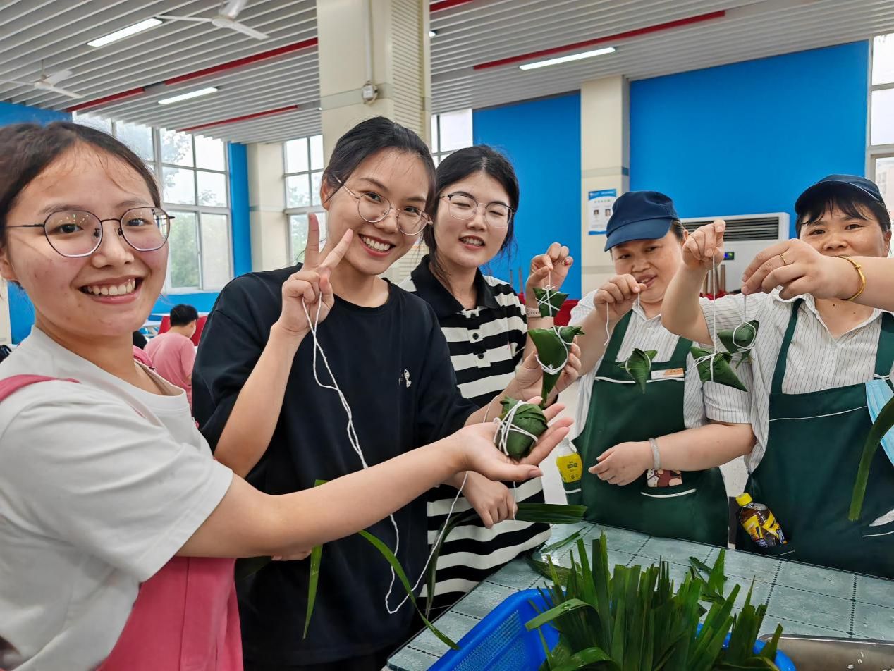 工作人员为大家精心准备了粽叶、蜜枣、糯米、绳子等材料,研究生们一起体验了包粽子、自制绿豆糕、巧立鸭蛋、折龙舟、缝香囊等活动。食堂阿姨“手把手”地教大家如何包粽子;烘焙师傅细心指导大家如何制作绿豆糕。当自己亲手包的粽子、亲自制作的糕点新鲜出炉时,大家非常开心。