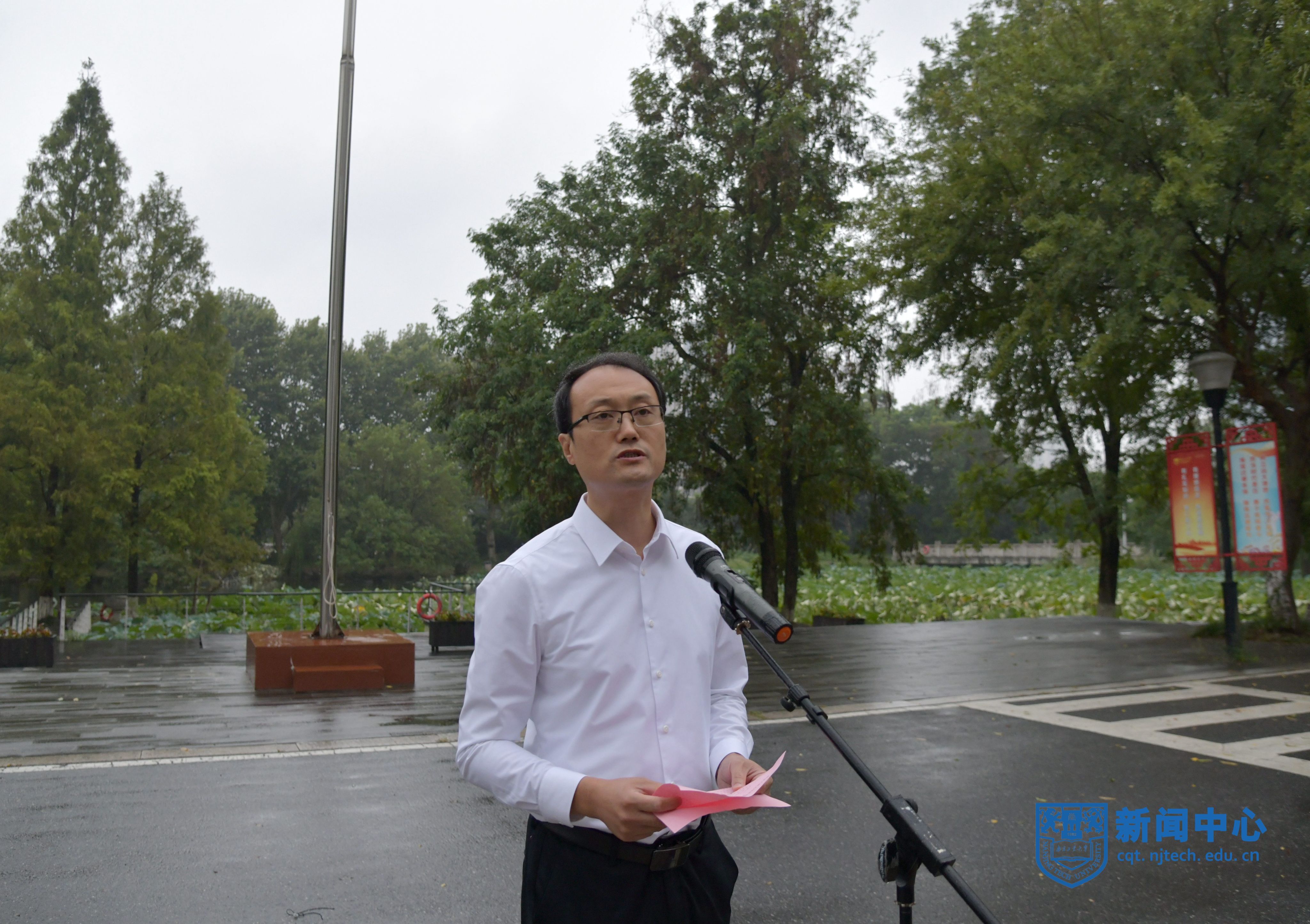 7点整,升国旗仪式正式开始。校国旗护卫队迈着整齐的步伐,护送国旗走向升旗台,在豪迈雄壮的《义勇军进行曲》中,鲜艳的五星红旗冉冉升起,在晨风中高高飘扬。在场师生高唱国歌,庄严地向国旗行注目礼。国家级青年人才、化工学院院长助理徐乐教授和校国旗护卫队队员、土木工程学院李沅泽同学作为师生代表发言,表达了真挚的爱国之情。广大师生共同祝福祖国生日快乐,祝愿我们伟大祖国永远繁荣昌盛。