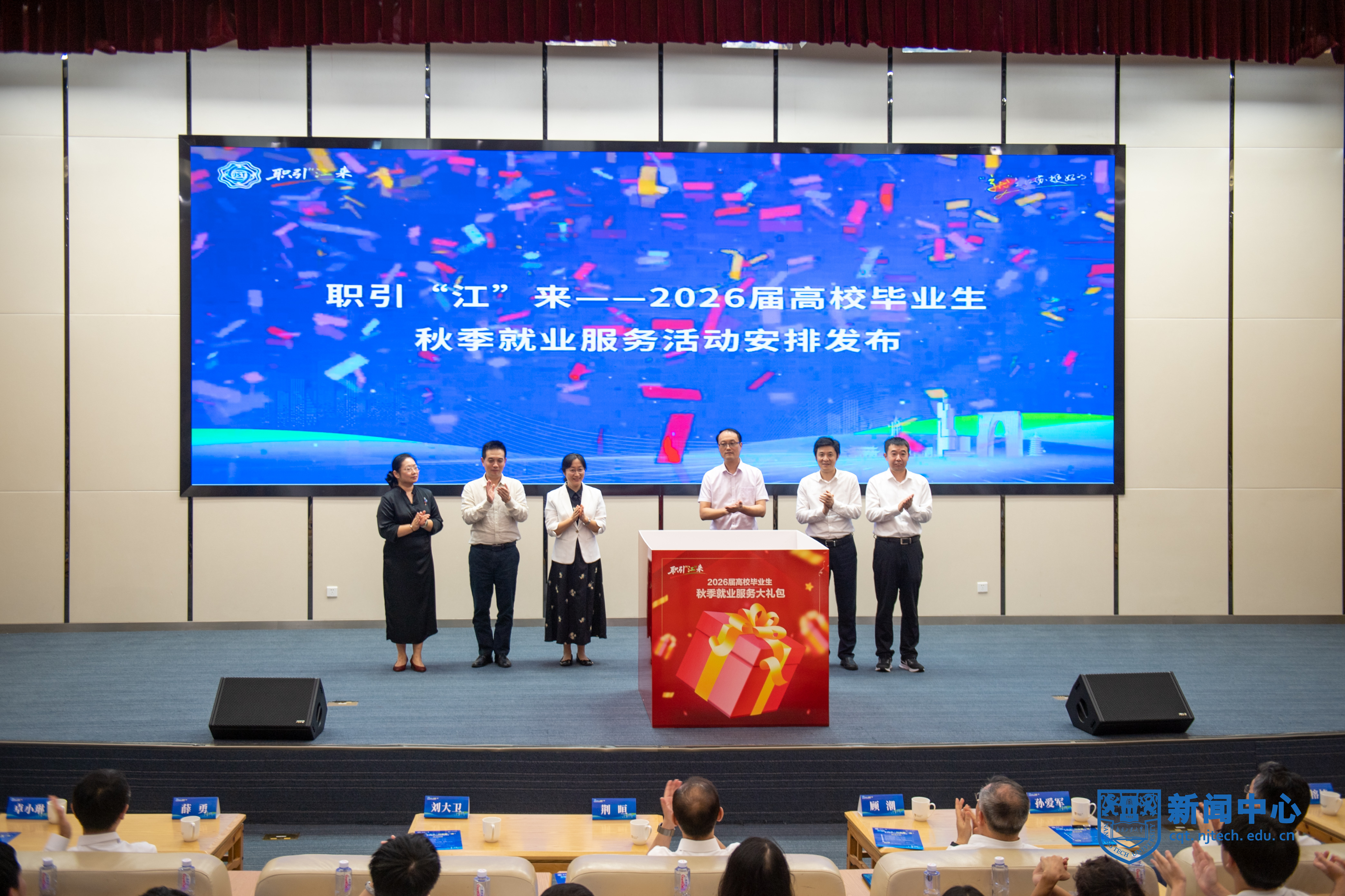刘大卫与缪榕楠、李晓军、南京市人才服务中心主任卓小琳以及与会高校就业工作负责人共同发布全省2026届高校毕业生秋季就业服务活动。